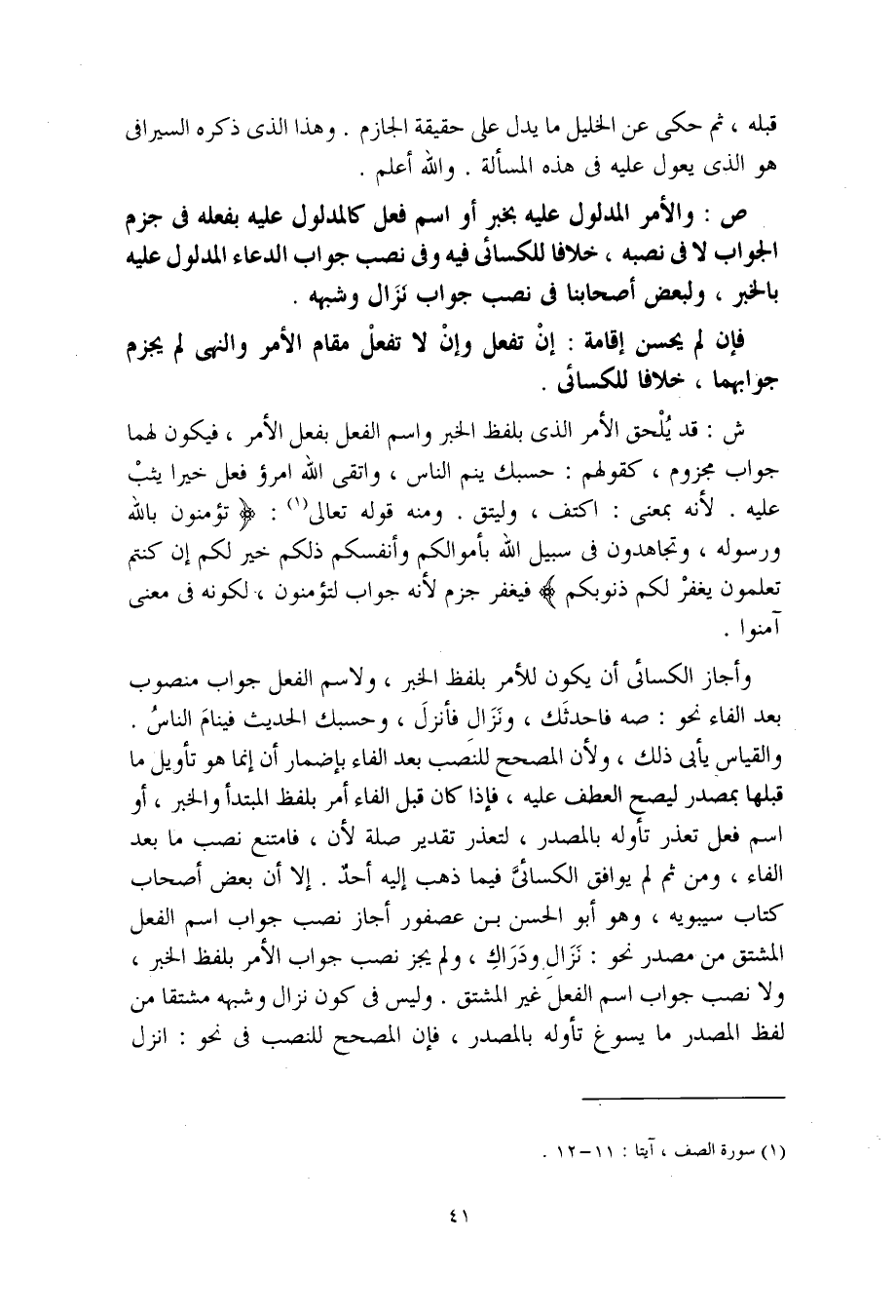 وأجاز الكسائي أن يكون للأمر بلفظ الخبر، ولاسم الفعل جواب منصوب بعد الفاء نحو: صه فاحدثَك، ونَزالِ فأنزلَ، وحسبك الحديث فينامَ الناسُ. والقياس يأبى ذلك، ولأن المصحح للنصب بعد الفاء بإضمار أن إنما هو تأويل ما قبلها بمصدر ليصح العطف عليه، فإذا كان قبل الفاء أمر بلفظ المبتدأ والخبر، أو اسم فعل تعذر تأوله بالمصدر، لتعذر تقدير صلة لأن، فامتنع نصب ما بعد الفاء، ومن ثم لم يوافق الكسائي فيما ذهب إليه أحدٌ. إلا أن بعض أصحاب كتاب سيبويه، وهو أبو الحسن بن عصفور أجاز نصب جواب اسم الفعل المشتق من مصدر نحو: نَزالِ ودَراكِ، ولم يجز نصب جواب الأمر بلفظ الخبر، ولا نصب جواب اسم الفعل غير المشتق. وليس في كون نزال وشبهه مشتقا من لفظ المصدر ما يسوغ تأوله بالمصدر، فإن المصحح للنصب في نحو: أنزل