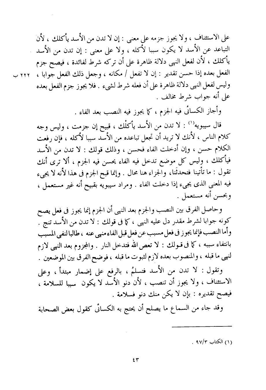 وتقول: لا تدن من الأسد فتسلمُ، بالرفع على إضمار مبتدأ، وعلى الاستئناف، ولا يجوز أن تنصب، لأن دنو الأسد لا يكون سببا للسلامة، فيصح تقديره: بإن لا يكن منك دنو فسلامة.