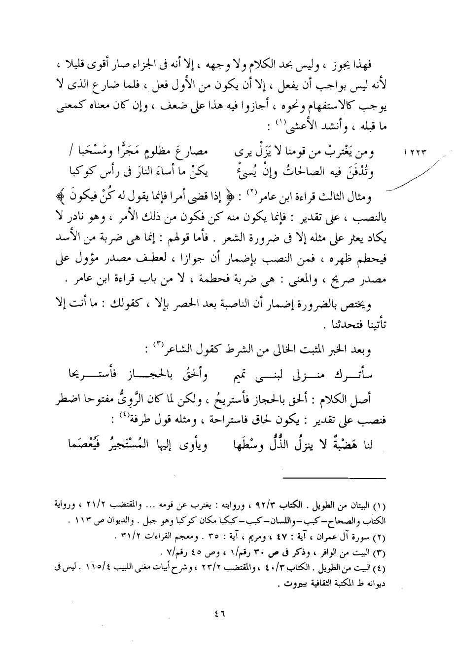 ومثال الثالث قراءة ابن عامر: (إذا قضى أمرا فإنما يقول له كنْ فيكونَ) بالنصب، على تقدير: فإنما يكون منه كن فيكون من ذلك الأمر، وهو نادر لا يكاد يعثر على مثله إلا في ضرورة الشعر. فأما قولهم: إنما هي ضربة من الأسد فيحطم ظهره، فمن النصب بإضمار أن جوازا، لعطف مصدر مؤول على مصدر صريح، والمعنى: هي ضربة فحطمة، لا من باب قراءة ابن عامر.