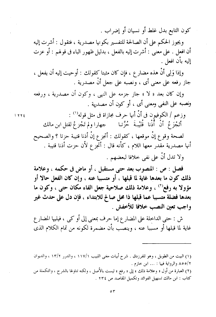 ش: حتى الداخلة على المضارع إما حرف بمعنى إلى أو كي، فيليها المضارع غاية لما قبلها أو مسببا عنه، وينصب بأن مضمرة لكونه من تمام الكلام الذي