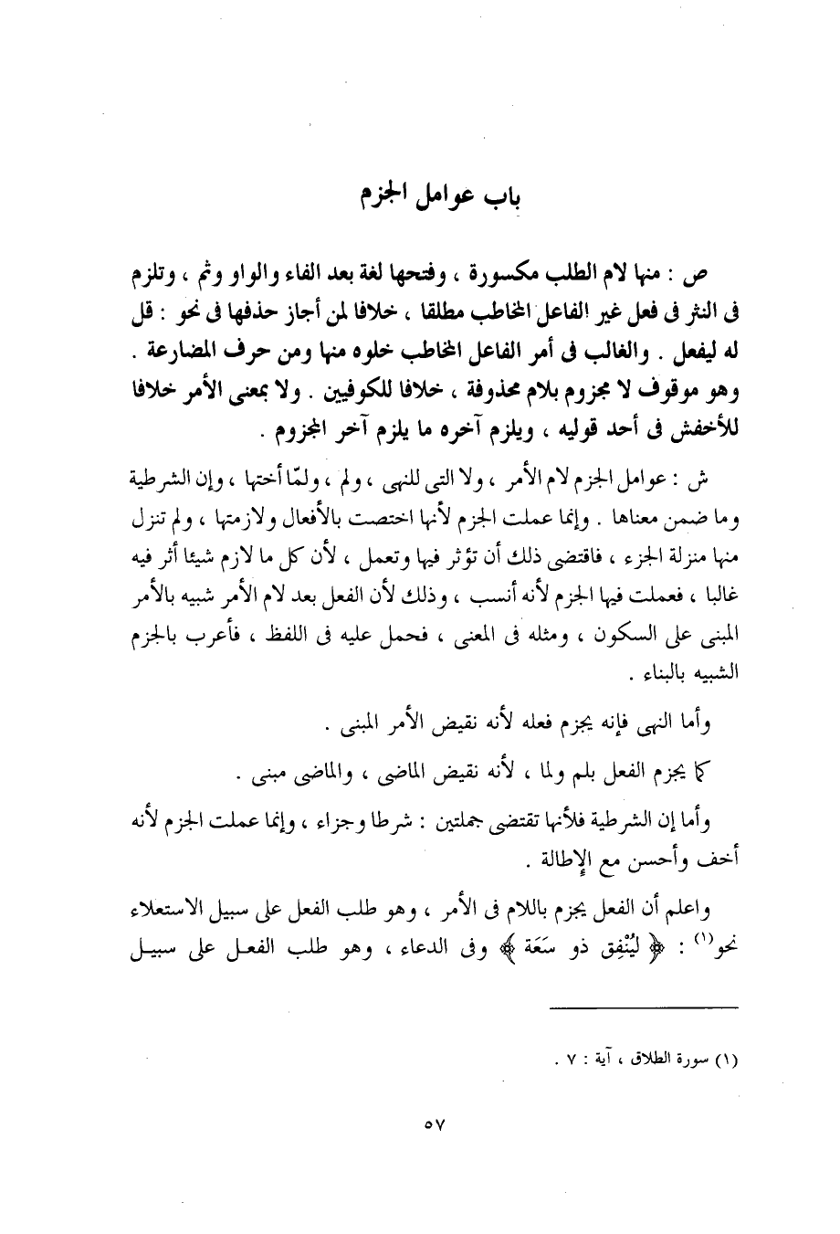 واعلم أن الفعل يجزم باللام في الأمر، وهو طلب الفل على سبيل الاستعلاء نحو: (ليُنْفِق ذو سَعَة) وفي الدعاء، وهو طلب الفعل على سبيل