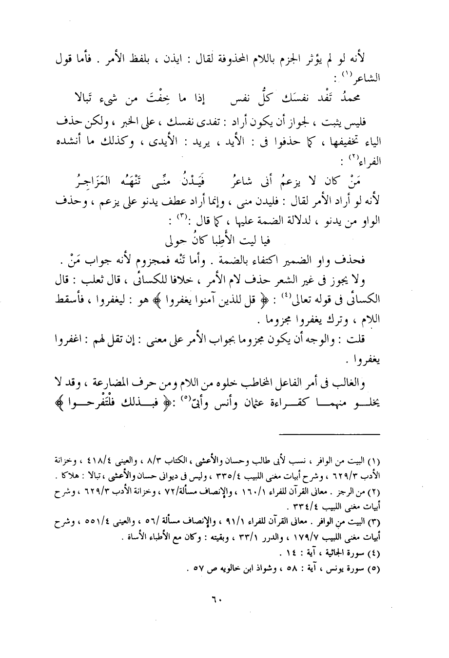 ولا يجوز في غير الشعر حذف لام الأمر، خلافا للكسائي، قال ثعلب: قال الكسائي في قوله تعالى: (قل للذين آمنوا يغفروا) هو: ليغفروا، فأسقط اللام، وترك يغفروا مجزوما.