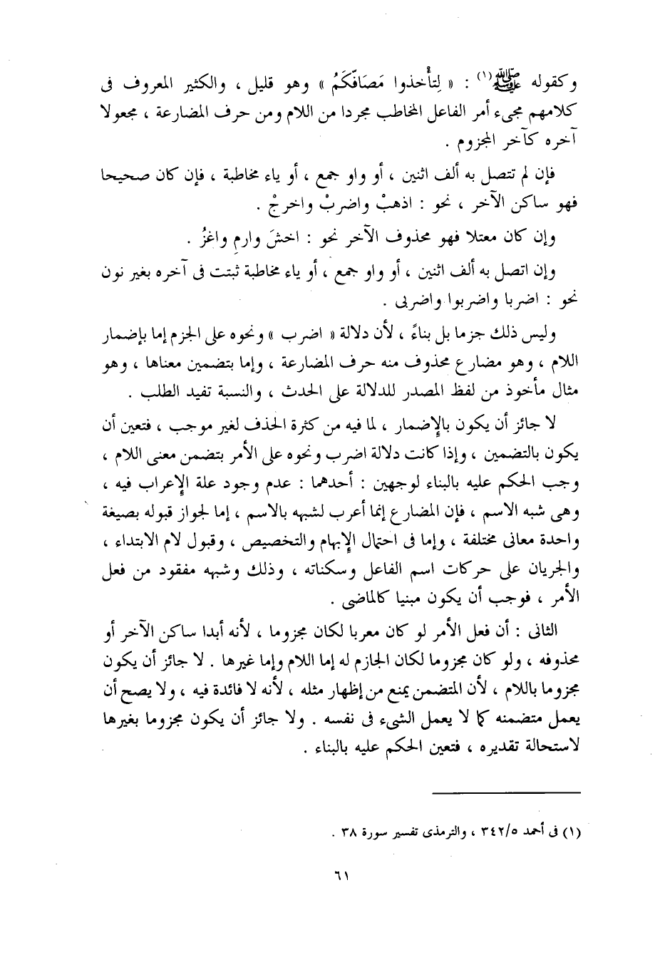 وكقوله صلى الله عليه وسلم: "لِتأخذوا مَصافَّكم" وهو قليل، والكثير المعروف في كلامهم مجيء أمر الفاعل المخاطب مجردا من اللام ومن حرف المضارعة، مجعولا آخره كآخر المجزوم.