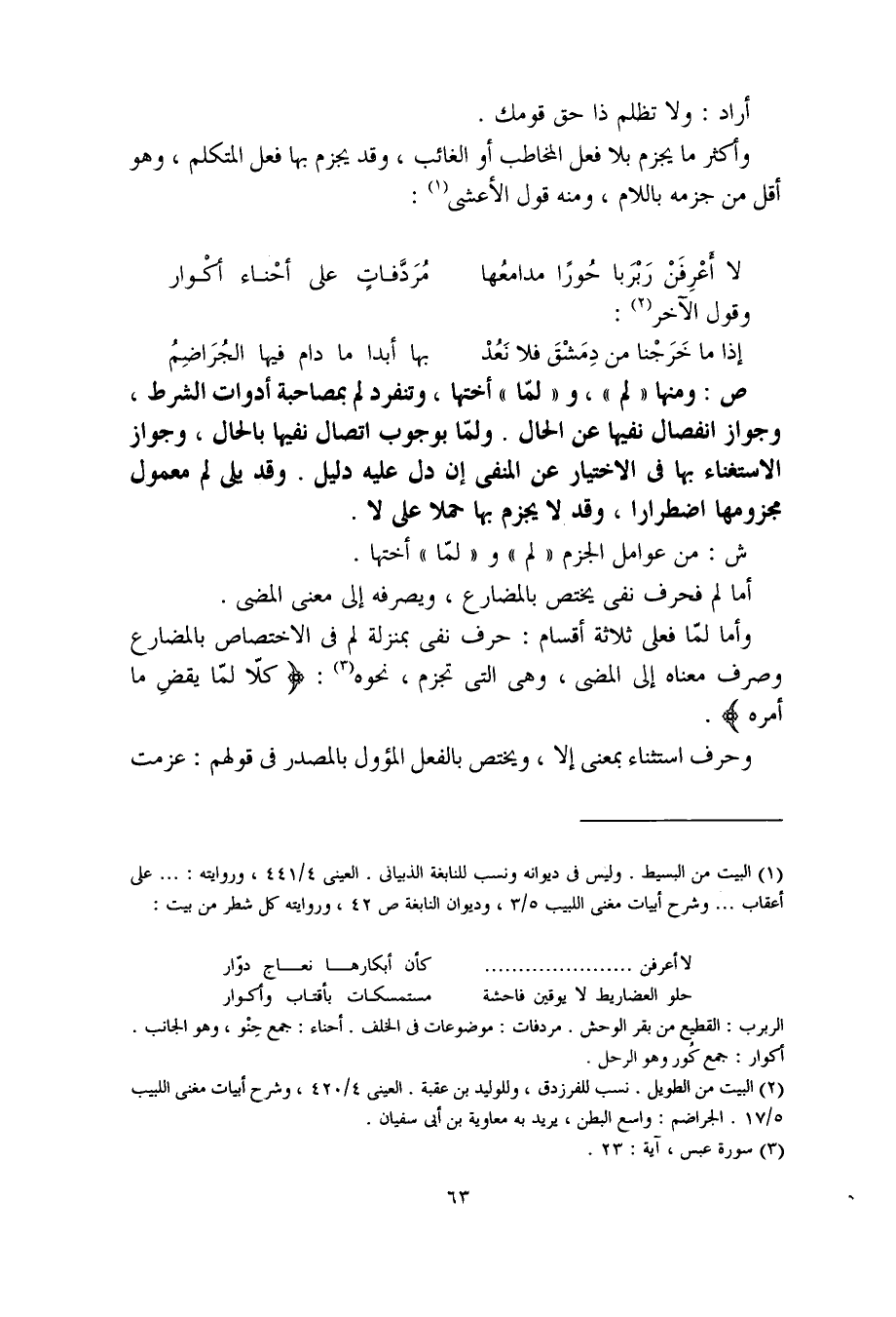 وأما لمّا فعلى ثلاثة أقسام: حرف نفي بمنزلة لم في الاختصاص بالمضارع وصرف معناه إلى المضي، وهي التي تجزم، نحوه: (كلّا لمّا يقضِ ما أمره).