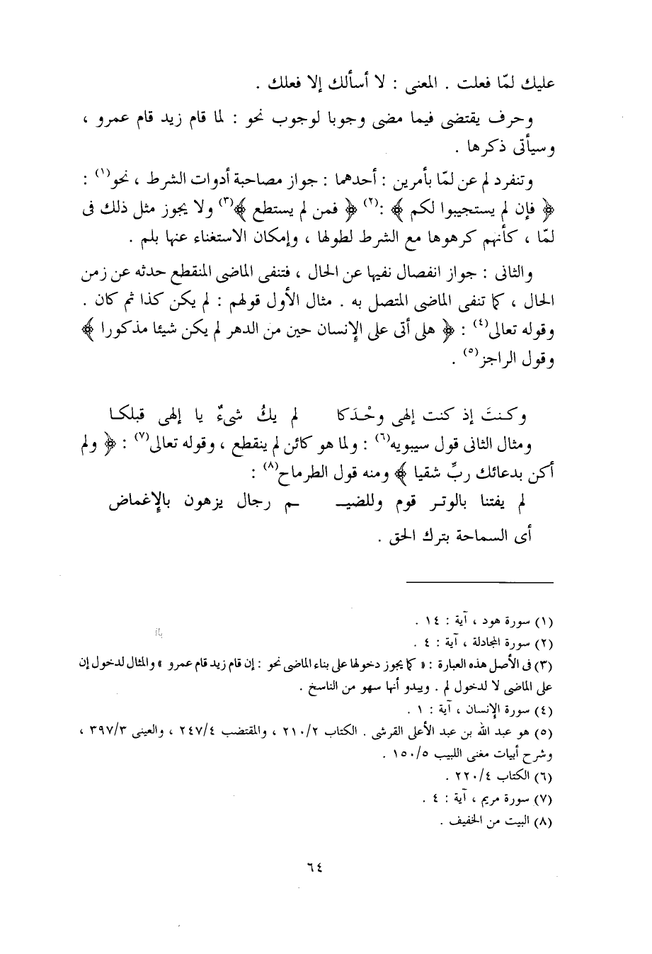 ومثال الثاني قول سيبويه: ولما هو كائن لم ينقطع، وقوله تعالى: (ولم أكن بدعائك ربِّ شقيا) ومنه قول الطرماح: