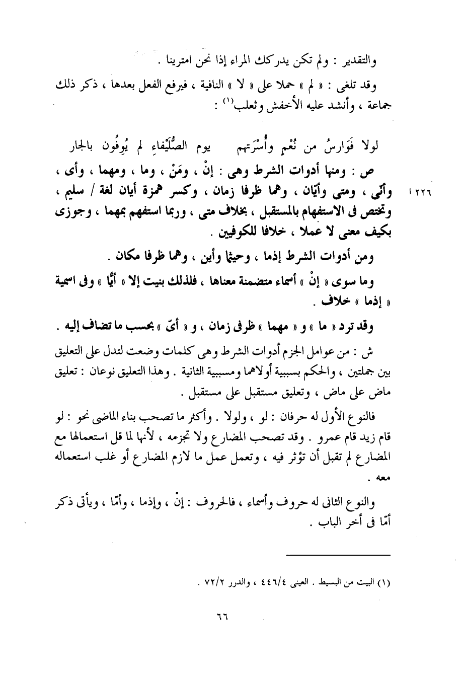 ش: من عوامل الجزم أدوت الشرط وهي كلمات وضعت لتدل على التعليق بين جملتين، والحكم بسببية أولاهما ومسببية الثانية. وهذا التعليق نوعان: تعليق ماض على ماض، وتعليق مستقبل على مستقبل.