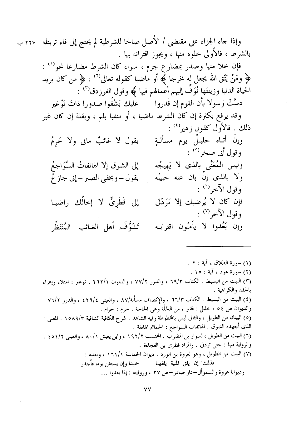 فإن خلا منها وصدر بمضارع جزم، سواء كان الشرط مضارعا نحو: (ومَنْ يتّق الله يجعل له مخرجا) أو ماضيا كقوله تعالى: (من كان يريد الحياة الدنيا وزينتَها نُوَفّ إليهم أعمالهم فيها) وقول الفرزدق: