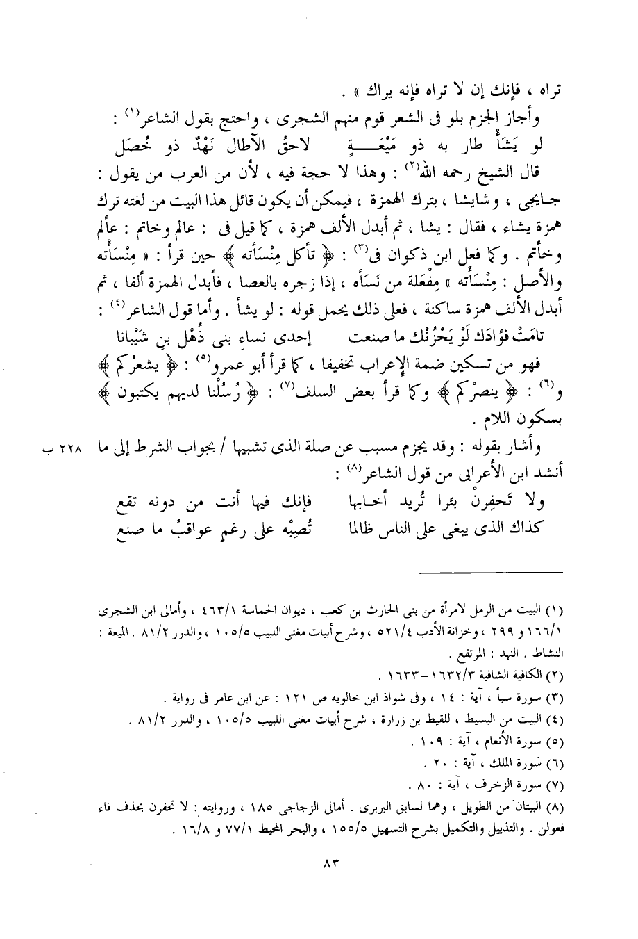 قال الشيخ رحمه الله: وهذا لا حجة فيه، لأن من العرب من يقول: جايجي، وشايشا، بترك الهمزة، فيمكن أن يكون قائل هذا البيت من لغته ترك همزة يشاء، فقال: يشا، ثم أبدل الألف همزة، كما قيل في: عالم وخاتم: عألم وخأتم. وكما فعل ابن ذكوان في: (تأكل مِنْسَأته) حين قرأ: "مِنْسَاته والأصل: مِنْسَأَته" مِفْعَلَى من نَسَأه، إذا زجره بالعصا، فأبدل الهمزة ألفا، ثم أبدل الألف همزة ساكنة، فعلى ذلك يحمل قوله: لو يشأ. وأما قول الشاعر:
