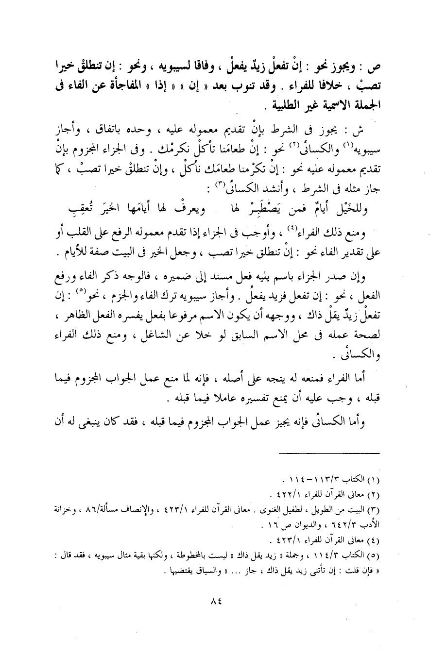 ومنع ذلك الفراء، وأوجب في الجزاء إذا تقدم معموله الرفع على القلب أو على تقدير الفاء نحو: إنْ تنطلق خيرا تصب، وجعل الخير في البيت صفة للأيام.