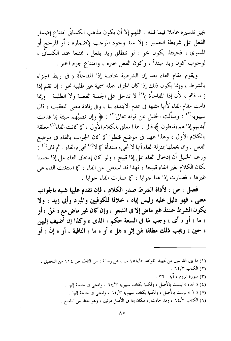 ويقوم مقام الفاء بعد إن الشرطية خاصة إذا المفاجأة (في ربط الجزاء بالشرط، وإنما يكون ذلك إذا كان الجزاء جملة اسمية غير طلبية نحو: إن تقم إذا زيد قائم، لأن إذا المفاجأة) لا تدخل على الجملة الفعلية ولا الطلبية. وإنما قامت مقام الفاء لأنها مثلها في عدم الابتداء بها، وفي إفادة معنى التعقيب، قال سيبويه: وسألت الخليل عن قوله تعالى: (وإن تصبْهم سيئة بما قدمت أيديهم إذا هم يقنطون) قال: هذا معلق بالكلام الأول، كما كانت الفاء معلقة بالكلام الأول، وهذا ههنا في موضع قنطوا كما كان الجواب بالفاء في موضع الفعل. ومما يجعلها بمنزلة الفاء أنها لا تجيء مبتدأة كما لا تجيء الفاء. ثم قال: وزعم اخليل أن إدخال الفاء على إذا قبيح، ولو كان إدخال الفاء على إذا حسنا لكان الكلام بغير الفاء قبيحا، فهذا قد استغنى عن الفاء، كما استغنت الفاء عن غيرها، فصارت إذا هنا جوابا، كما صارت الفاء جوابا.