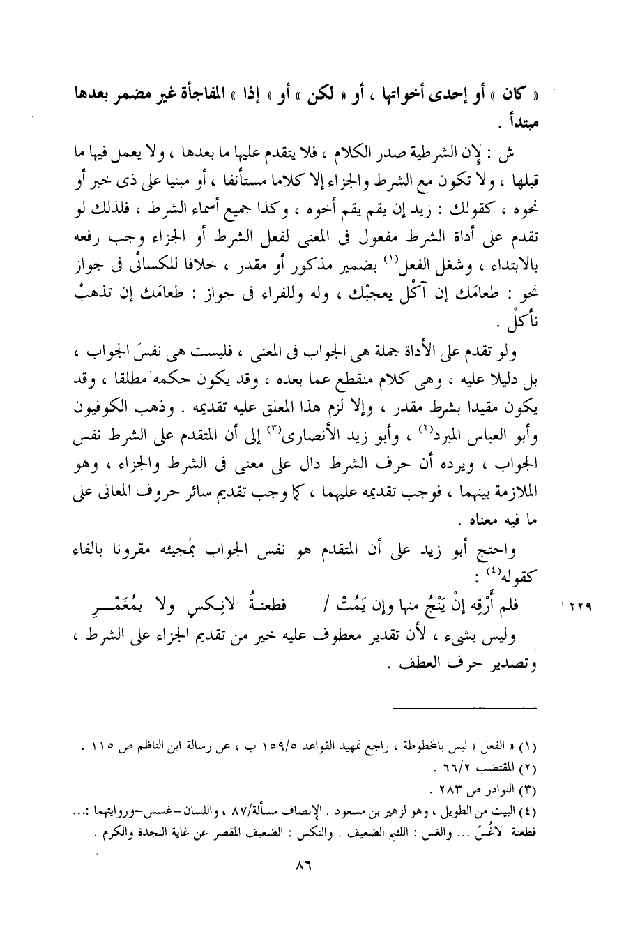 واحتج أبو زيد على أن المتقدم هو نفس الجواب بمجيئه مقرونا بالفاء كقوله: