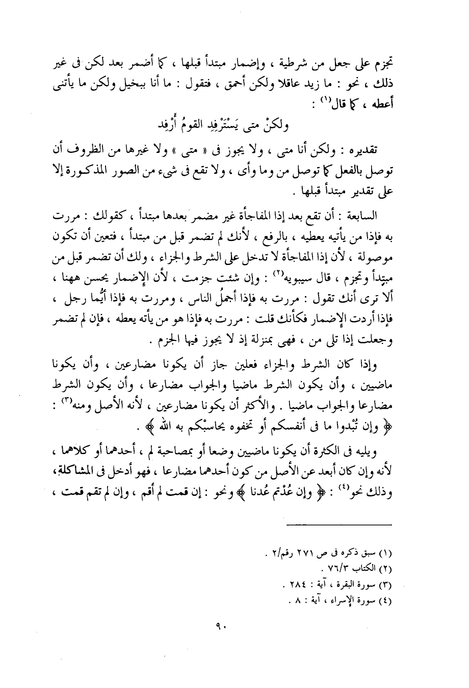 السابعة: أن تقع بعد إذا المفاجأة غير مضمر بعدها مبتدأ، كقولك: مررت به فإذا من يأتيه أعطيه، بالرفع، لأنك لم تضمر قبل من مبتدأ، فتعين أن تكون موصولة، لأن إذا المفاجأة لا تدخل على الشرط والجزاء، ولك أن تضمر قبل من مبتدأ وتجزم، قال سيبويه: وإن شئت جزمت، لأن الإضمار يحسن ههنا، ألا ترى أنك تقول، مررت به فإذا أجملُ الناس، ومررت به فإذا أيُّما رجل، فإذا أردت الإضمار فكأنك قلت: مررت به فإذا هو من يأته يعطه، فإن لم تضمر وجعلت إذا تلى من، فهي بمنزلة إذ لا يجوز فيها الجزم.