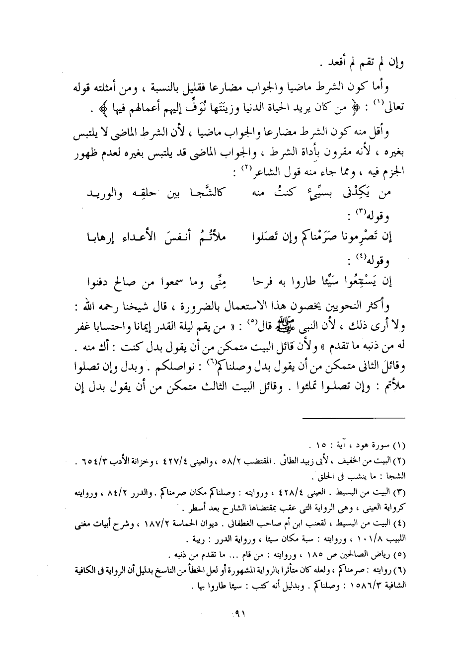 وأكثر النحويين يخصون هذا الاستعمال بالضرورة، قال شيخنا رحمه الله: ولا أرى ذلك، لأن النبي صلى الله عليه وسلم قال: "من يقم ليلة القدر إيمانا واحتسابا غفر له من ذنبه ما تقدم" ولأن قائل البيت متمكن من أن يقول بدل كنت: أك منه. وقائل الثاني متمكن من أن يقول بدل وصلناكم: نواصلكم. وبدل وإن تصلوا ملأتم: وإن تصلوا تملئوا. وقائل البيت الثالث متمكن من أن يقول بدل إن