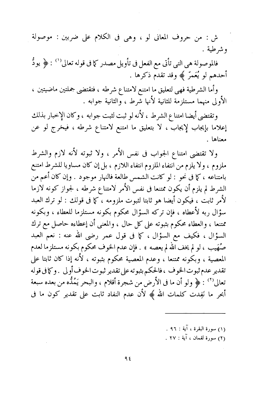ولا تقتضي امتناع الجواب في نفس الأمر، ولا ثبوته لأنه لازم والشرط ملزوم، ولا يلزم من انتفاء الملزوم انتفاء اللازم، بل إن كان مساويا للشرط امتنع بامتناعه، كما في نحو: لو كانت الشمس طالعة فالنهار موجود. وإن كان أعم من الشرط لم يلزم أن يكون ممتنعا في نفس الأمر لامتناع شرطه، لجواز كونه لازما لأمر ثابت، فيكون أيضا هو ثابتا لثبوت ملزومه، كما في قولك: لو ترك العبد سؤال ربه لأعطاه، فإن تركه السؤال محكوم بكونه مستلزما للعطاء، وبكونه ممتنعا، والعطاء محكوم بثبوته على كل حال، والمعنى أن إعطاءه حاصل مع ترك السؤال، فكيف مع السؤال، كما في قول عمر رضي الله عنه: نعم العبد صُهَيب، لو لم يخف الله لم يعصه". فإن عدم الخوف محكوم بكونه مستلزما لعدم المعصية، وبكونه ممتنعا، وعدم المعصية محكوم بثبوته، لأنه إذا كان ثابتا على تقدير عدم ثبوت الخوف، فالحكم بثبوته على تقدير ثبوت الخوف أولى. وكما في قوله تعالى: (ولو أن ما في الأرض من شجرة أقلام، والبحر يمُدُّه من بعده سبعة أبحر ما نفدت كلمات الله) لأن عدم النفاد ثابت على تقدير كون ما في