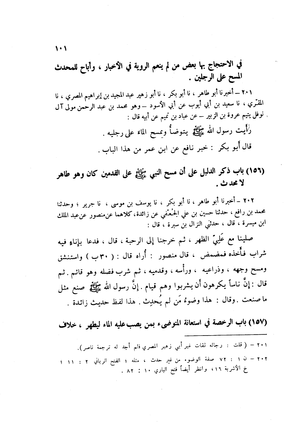 201 - نا أَبُو زُهَيْرٍ عَبْدُ الْمَجِيدِ بْنُ إِبْرَاهِيمَ الْمِصْرِيُّ، نا الْمُقْرِئُ، نا سَعِيدُ بْنُ أَبِي أَيُّوبَ، عَنْ أَبِي الْأَسْوَدِ وَهُوَ مُحَمَّدُ بْنُ عَبْدِ الرَّحْمَنِ مَوْلَى آلِ نَوْفَلٍ يَتِيمُ عُرْوَةَ بْنِ الزُّبَيْرِ، عَنْ عَبَّادِ بْنِ تَمِيمٍ، عَنْ أَبِيهِ قَالَ: «رَأَيْتُ رَسُولَ اللَّهِ صَلَّى اللهُ عَلَيْهِ وَسَلَّمَ §يَتَوَضَّأُ وَيَمْسَحُ الْمَاءَ عَلَى رِجْلَيْهِ» قَالَ أَبُو بَكْرٍ: «خَبَرُ نَافِعٍ، عَنِ ابْنِ عُمَرَ مِنْ هَذَا الْبَابِ» K201 - قال الألباني: رجاله ثقات غير أبي زهير المصري لم أجد له ترجمة