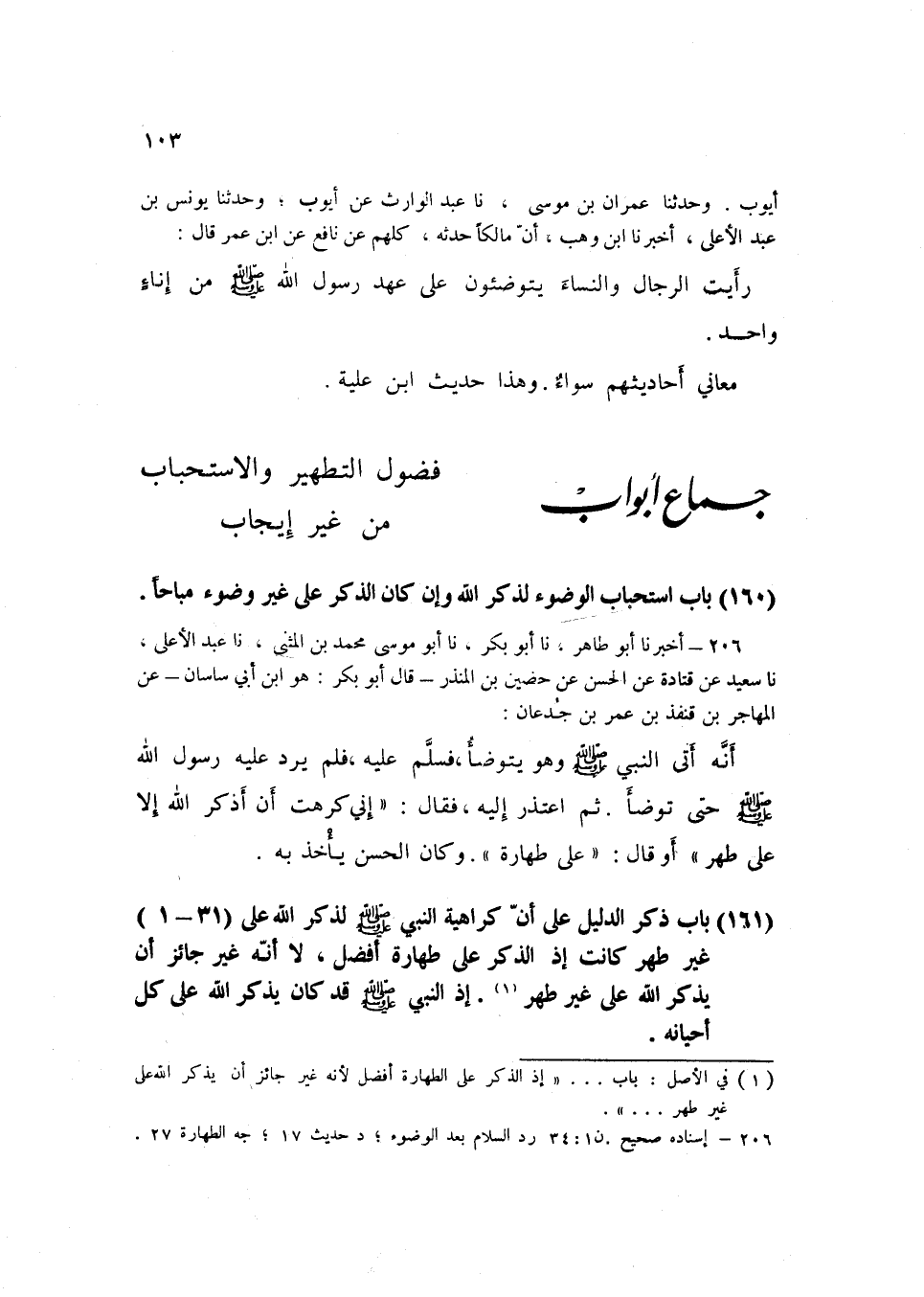 206 - نا أَبُو مُوسَى مُحَمَّدُ بْنُ الْمُثَنَّى، نا عَبْدُ الْأَعْلَى، نا سَعِيدٌ، عَنْ قَتَادَةَ، عَنِ الْحَسَنِ، عَنْ حُصَيْنِ بْنِ الْمُنْذِرِ - قَالَ أَبُو بَكْرٍ: هُوَ ابْنُ أَبِي سَاسَانَ - عَنِ الْمُهَاجِرِ بْنِ قُنْفُذِ بْنِ عُمَرَ بْنِ جُدْعَانَ، أَنَّهُ أَتَى النَّبِيَّ صَلَّى اللهُ عَلَيْهِ وَسَلَّمَ وَهُوَ يَتَوَضَّأُ فَسَلَّمَ عَلَيْهِ، فَلَمْ يَرُدَّ عَلَيْهِ رَسُولُ اللَّهِ صَلَّى اللهُ عَلَيْهِ وَسَلَّمَ حَتَّى تَوَضَّأَ، ثُمَّ اعْتَذَرَ إِلَيْهِ فَقَالَ: «§إِنِّي كَرِهْتُ أَنْ أَذْكُرَ اللَّهَ إِلَّا عَلَى طُهْرٍ» أَوْ قَالَ: «عَلَى طَهَارَةٍ» ، وَكَانَ الْحَسَنُ يَأْخُذُ بِهِK206 - قال الأعظمي: إسناده صحيح