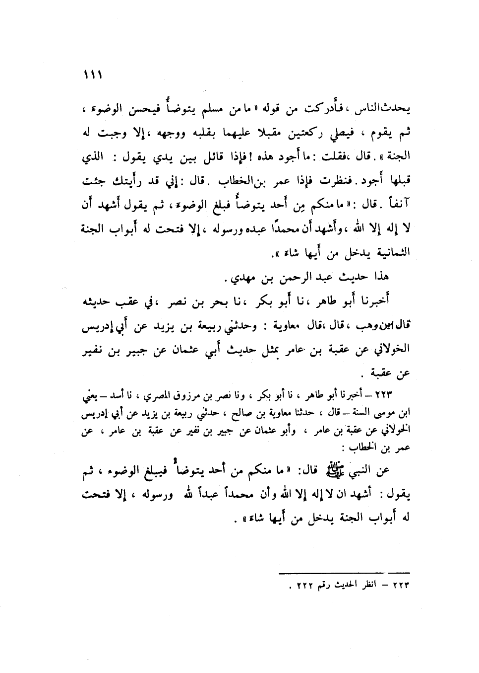 223 - وَنا نَصْرُ بْنُ مَرْزُوقٍ الْمِصْرِيُّ، نا أَسَدُ - يَعْنِي ابْنَ مُوسَى - السُّنَّةِ قَالَ: حَدَّثَنَا مُعَاوِيَةُ بْنُ صَالِحٍ، حَدَّثَنِي رَبِيعَةُ بْنُ يَزِيدَ، عَنْ أَبِي إِدْرِيسَ الْخَوْلَانِيِّ، عَنْ عُقْبَةَ بْنِ عَامِرٍ، وَأَبُو عُثْمَانَ، عَنْ جُبَيْرِ بْنِ نُفَيْرٍ، عَنْ عُقْبَةَ بْنِ عَامِرٍ، عَنْ عُمَرَ بْنِ الْخَطَّابِ، عَنِ النَّبِيِّ صَلَّى اللهُ عَلَيْهِ وَسَلَّمَ قَالَ: " §مَا مِنْكُمْ مِنْ أَحَدٍ يَتَوَضَّأُ فَيُبْلُغُ الْوُضُوءَ، ثُمَّ يَقُولُ: أَشْهَدُ أَنْ لَا إِلَهَ إِلَّا اللَّهُ، وَأَنَّ مُحَمَّدًا عَبْدُ للَّهِ وَرَسُولُهُ إِلَّا فُتِحَتْ لَهُ أَبْوَابُ الْجَنَّةِ يَدْخُلُ مِنْ أَيِّهَا شَاءَ "