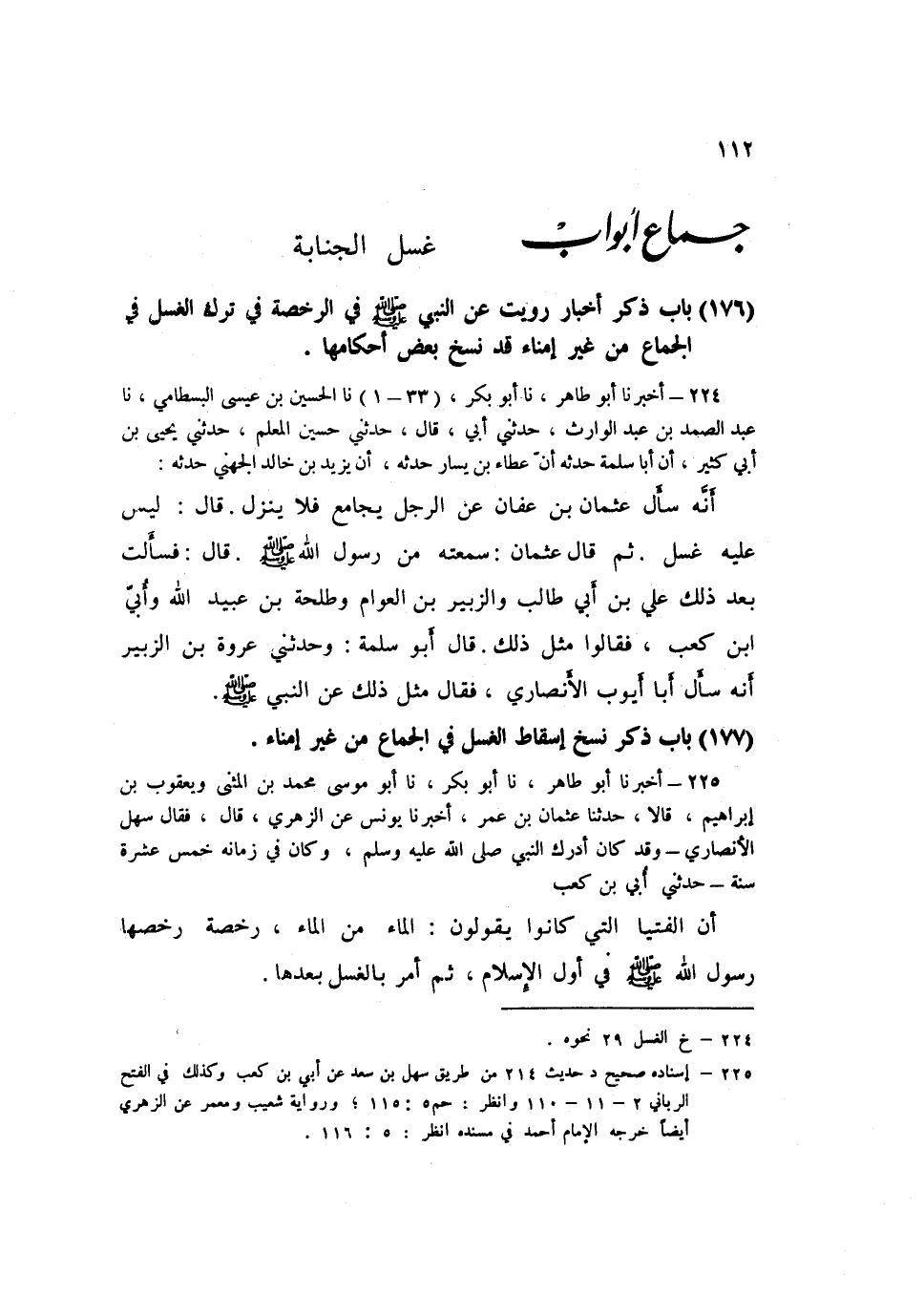224 - نا الْحُسَيْنُ بْنُ عِيسَى الْبِسْطَامِيُّ، نا عَبْدُ الصَّمَدِ بْنُ عَبْدِ الْوَارِثِ، حَدَّثَنِي أَبِي قَالَ: حَدَّثَنِي حُسَيْنٌ الْمُعَلِّمُ، حَدَّثَنِي يَحْيَى بْنُ أَبِي كَثِيرٍ، أَنَّ أَبَا سَلَمَةَ حَدَّثَهُ، أَنَّ عَطَاءَ بْنَ يَسَارٍ حَدَّثَهُ، أَنَّ زَيْدَ بْنِ خَالِدٍ الْجُهَنِيَّ حَدَّثَهُ أَنَّهُ، سَأَلَ عُثْمَانَ بْنَ عَفَّانَ عَنِ §الرَّجُلِ يُجَامِعُ فَلَا يُنْزِلُ قَالَ: «لَيْسَ عَلَيْهِ غُسْلٌ» ، ثُمَّ قَالَ عُثْمَانُ: «سَمِعَتْهُ مِنْ رَسُولِ اللَّهِ صَلَّى اللهُ عَلَيْهِ وَسَلَّمَ» . قَالَ: فَسَأَلْتُ بَعْدَ ذَلِكَ عَلِيَّ بْنَ أَبِي طَالِبٍ، وَالزُّبَيْرَ بْنَ الْعَوَّامِ، وَطَلْحَةَ بْنَ عُبَيْدِ اللَّهِ، وَأُبَيِّ بْنِ كَعْبٍ فَقَالُوا: مِثْلَ ذَلِكَ قَالَ أَبُو سَلَمَةَ: «وَحَدَّثَنِي عُرْوَةُ بْنُ الزُّبَيْرِ أَنَّهُ سَأَلَ أَبَا أَيُّوبَ الْأَنْصَارِيَّ فَقَالَ مِثْلَ ذَلِكَ عَنِ النَّبِيِّ صَلَّى اللهُ عَلَيْهِ وَسَلَّمَ»