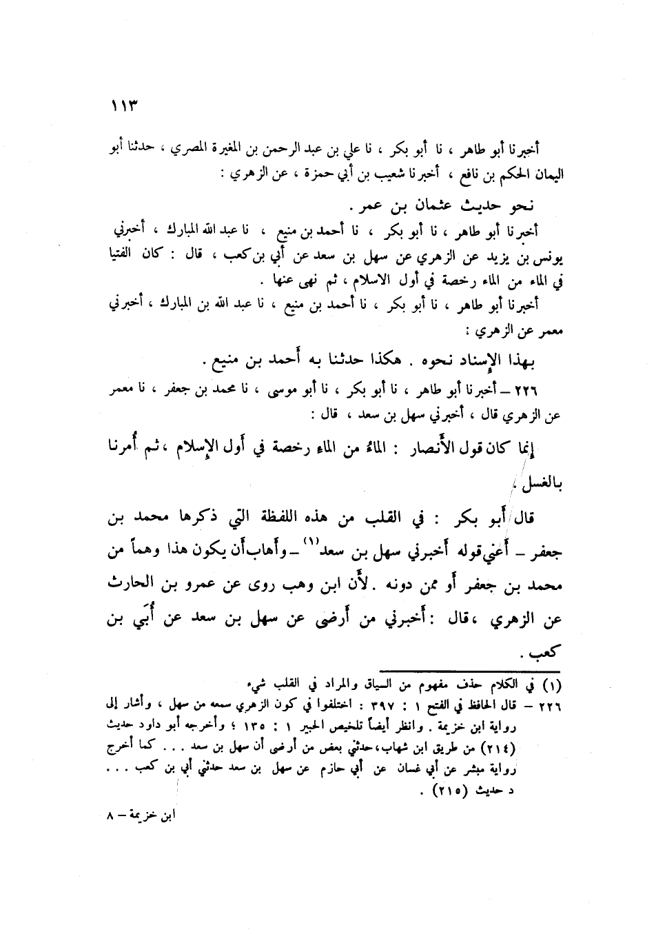 226 - نا أَبُو مُوسَى، نا مُحَمَّدُ بْنُ جَعْفَرٍ، نا مَعْمَرٌ، عَنِ الزُّهْرِيِّ قَالَ: أَخْبَرَنِي سَهْلُ بْنُ سَعْدٍ قَالَ: «إِنَّمَا كَانَ §قَوْلُ الْأَنْصَارِ الْمَاءُ مِنَ الْمَاءِ رُخْصَةً فِي أَوَّلِ الْإِسْلَامِ، ثُمَّ أُمِرْنَا بِالْغُسْلِ» قَالَ أَبُو بَكْرٍ: " فِي الْقَلْبِ مِنْ هَذِهِ اللَّفْظَةِ الَّتِي ذَكَرَهَا مُحَمَّدُ بْنُ جَعْفَرٍ، أَعْنِي قَوْلَهُ: أَخْبَرَنِي سَهْلُ بْنُ سَعْدٍ، وَأَهَابُ أَنْ يَكُونَ هَذَا وَهْمًا مِنْ مُحَمَّدِ بْنِ جَعْفَرٍ، أَوْ مِمَّنْ دُونَهُ؛ لِأَنَّ ابْنَ وَهْبٍ رَوَى عَنْ عَمْرِو بْنِ الْحَارِثِ، عَنِ الزُّهْرِيِّ قَالَ: أَخْبَرَنِي مَنْ أَرْضَى، عَنْ سَهْلِ بْنِ سَعْدٍ، عَنْ أُبَيِّ بْنِ كَعْبٍ. هَذِهِ اللَّفْظَةُ حَدَّثَنِيهَا أَحْمَدُ بْنُ عَبْدِ الرَّحْمَنِ بْنِ وَهْبٍ، حَدَّثَنَا عَمِّي قَالَ: حَدَّثَنِي عَمْرٌو وَهَذَا الرَّجُلُ الَّذِي لَمْ يُسَمِّهِ عَمْرُو بْنُ الْحَارِثِ يُشْبِهُ أَنْ يَكُونَ أَبَا حَازِمٍ سَلَمَةَ بْنَ دِينَارٍ؛ لِأَنَّ مَيْسَرَةَ بْنَ إِسْمَاعِيلَ رَوَى هَذَا الْخَبَرَ، عَنْ أَبِي غَسَّانَ مُحَمَّدِ بْنِ مُطَرِّفٍ، عَنْ أَبِي حَازِمٍ، عَنْ سَهْلِ بْنِ سَعْدٍ، عَنْ مُسْلِمِ بْنِ الْحَجَّاجِ، وَقَالَ: حَدَّثَنَا أَبُو جَعْفَرٍ الْحَمَّالُ "