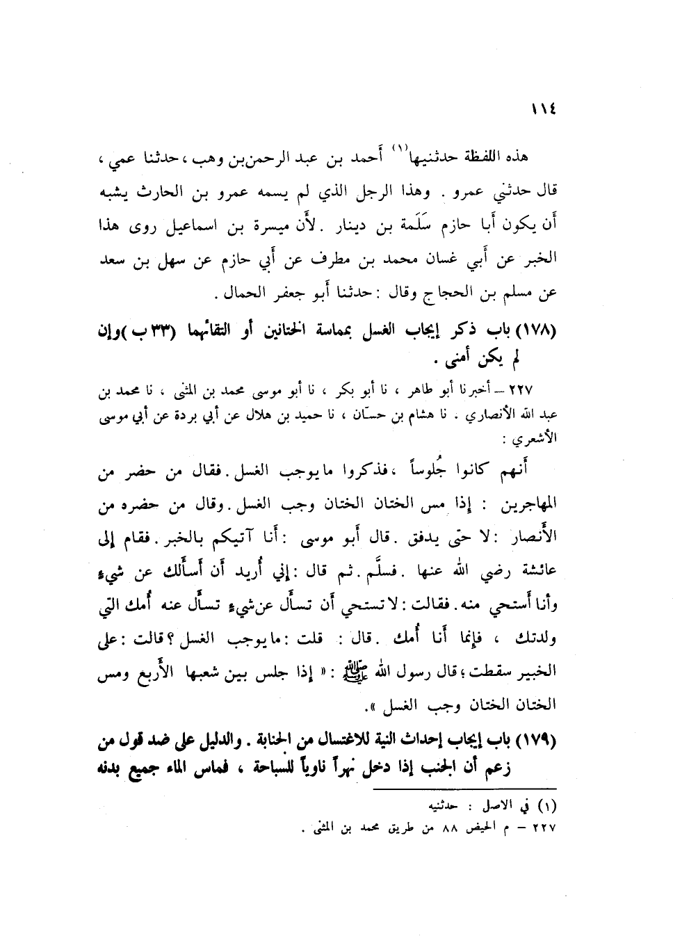 227 - نا أَبُو مُوسَى مُحَمَّدُ بْنُ الْمُثَنَّى، نا مُحَمَّدُ بْنُ عَبْدِ اللَّهِ الْأَنْصَارِيُّ، نا هِشَامُ بْنُ حَسَّانَ، نا حُمَيْدُ بْنُ هِلَالٍ، عَنْ أَبِي بُرْدَةَ، عَنْ أَبِي مُوسَى الْأَشْعَرِيِّ أَنَّهُمْ كَانُوا جُلُوسًا فَذَكَرُوا مَا يُوجِبُ الْغُسْلَ، فَقَالَ مَنْ حَضَرَ مِنَ الْمُهَاجِرِينَ: إِذَا مَسَّ الْخِتَانُ الْخِتَانَ وَجَبَ الْغُسْلُ، وَقَالَ مَنْ حَضَرَهُ مِنَ الْأَنْصَارِ: لَا حَتَّى يَدْفُقَ قَالَ أَبُو مُوسَى: أَنَا آتِيكُمْ بِالْخَبَرِ، فَقَامَ إِلَى عَائِشَةَ رَضِي اللَّهُ تَعَالَى عَنْهَا فَسَلَّمَ، ثُمَّ قَالَ: إِنِّي أُرِيدُ أَنْ أَسْأَلَكِ عَنْ شَيْءٍ وَأنَا أَسْتَحِي مِنْهُ، فَقَالَتْ: لَا تَسْتَحِ أَنْ تَسْأَلَ عَنْ شَيْءٍ تَسْأَلُ عَنْهُ أُمَّكَ الَّتِي وَلَدَتْكَ فَإِنَّمَا أنَا أُمُّكَ. قَالَ: قُلْتُ: مَا يُوجِبُ الْغُسْلَ؟ قَالَتْ: عَلَى الْخَبِيرِ سَقَطْتَ قَالَ رَسُولُ اللَّهِ صَلَّى اللهُ عَلَيْهِ وَسَلَّمَ: «§إِذَا جَلَسَ بَيْنَ شُعَبِهَا الْأَرْبَعِ، وَمَسَّ الْخِتَانُ الْخِتَانَ وَجَبَ الْغُسْلُ»