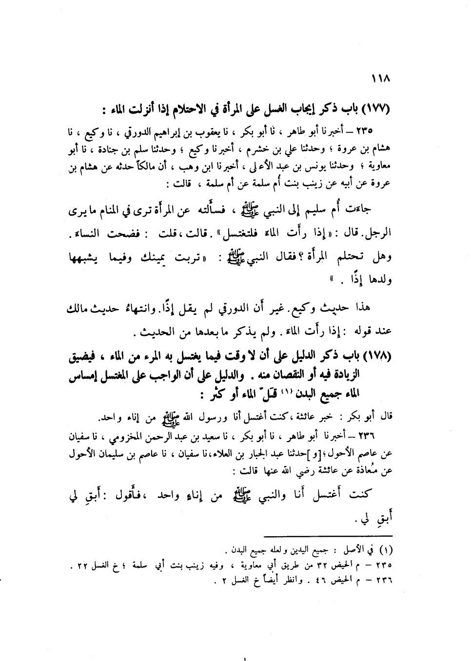 235 - نا يَعْقُوبُ بْنُ إِبْرَاهِيمَ الدَّوْرَقِيُّ، نا وَكِيعٌ، نا هِشَامُ بْنُ عُرْوَةَ، وَحَدَّثَنَا عَلِيُّ بْنُ خَشْرَمٍ، أَخْبَرَنَا وَكِيعٌ، وَحَدَّثَنَا سَلْمُ بْنُ جُنَادَةَ، نا أَبُو مُعَاوِيَةَ، وَحَدَّثَنَا يُونُسُ بْنُ عَبْدِ الْأَعْلَى، أَخْبَرَنَا ابْنُ وَهْبٍ، أَنَّ مَالِكًا حَدَّثَهُ، عَنْ هِشَامِ بْنِ عُرْوَةَ، عَنْ أَبِيهِ، عَنْ زَيْنَبَ بِنْتِ أُمِّ سَلَمَةَ، عَنْ أُمِّ سَلَمَةَ قَالَتْ: جَاءَتْ أُمُّ سُلَيْمٍ إِلَى النَّبِيِّ صَلَّى اللهُ عَلَيْهِ وَسَلَّمَ فَسَأَلْتُهُ عَنِ الْمَرْأَةِ تَرَى فِي الْمَنَامِ مَا يَرَى الرَّجُلُ؟ قَالَ: «§إِذَا رَأَتِ الْمَاءَ فَلْتَغْتَسِلْ» . قَالَتْ: قُلْتُ: فَضَحْتِ النِّسَاءَ، وَهَلْ تَحْتَلِمُ الْمَرْأَةُ؟ فَقَالَ النَّبِيُّ صَلَّى اللهُ عَلَيْهِ وَسَلَّمَ: «تَرِبَتْ يَمِينُكِ وَفِيمَا يُشْبِهُهَا وَلَدُهَا إِذًا» هَذَا حَدِيثُ وَكِيعٍ , غَيْرُ أَنَّ الدَّوْرَقِيَّ لَمْ يَقُلْ إِذًا وَانْتِهَاءُ حَدِيثِ مَالِكٍ عِنْدَ قَوْلِهِ: إِذَا رَأَتِ الْمَاءَ، وَلَمْ يَذْكُرُ مَا بَعْدَهَا مِنَ الْحَدِيثِ "