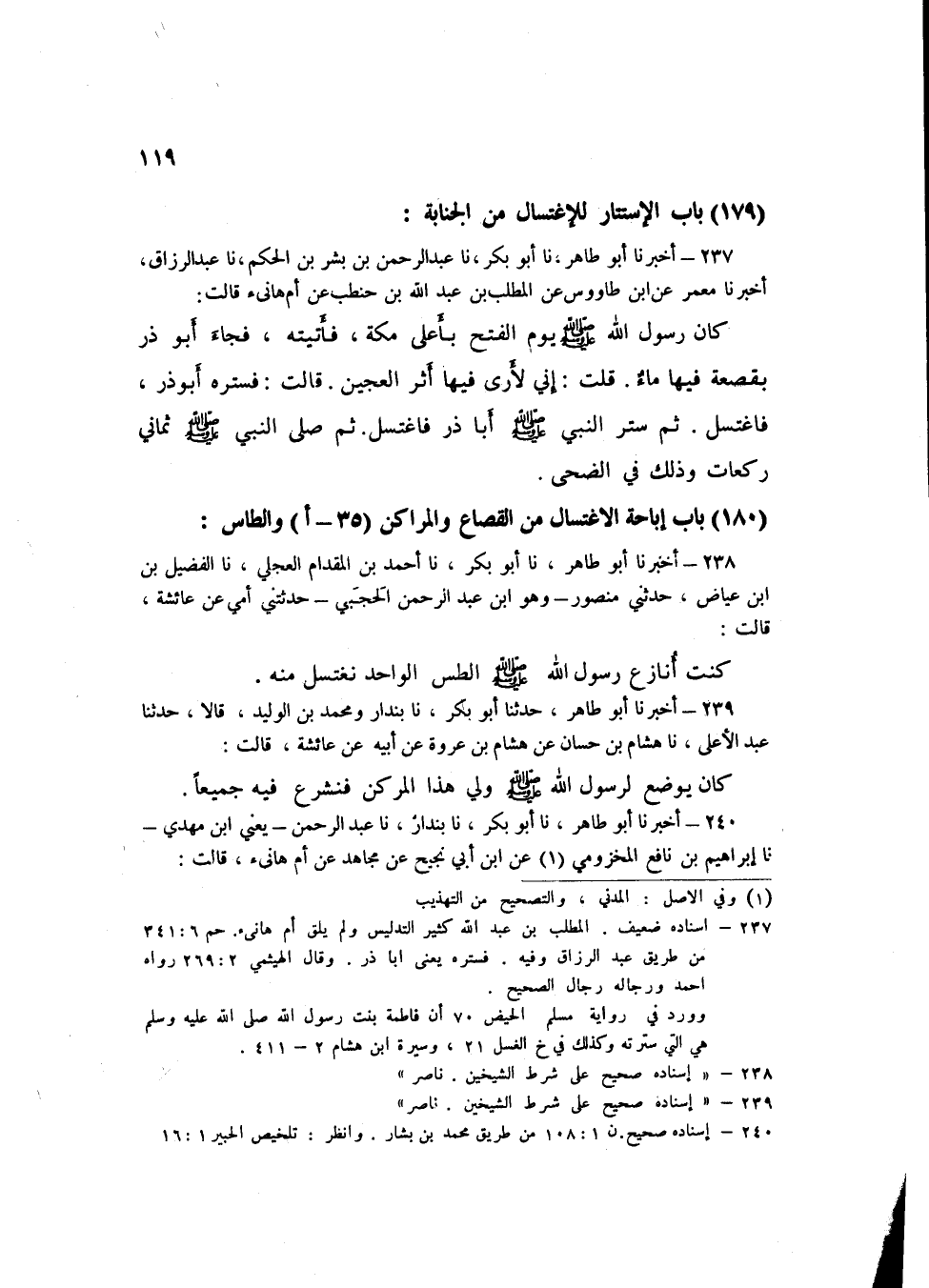 237 - نا عَبْدُ الرَّحْمَنِ بْنُ بِشْرِ بْنِ الْحَكَمِ، نا عَبْدُ الرَّزَّاقِ، أَخْبَرَنَا مَعْمَرٌ، عَنِ ابْنِ طَاوُسٍ، عَنِ الْمُطَّلِبِ بْنِ عَبْدِ اللَّهِ بْنِ حَنْطَبٍ، عَنْ أُمِّ هَانِئٍ قَالَتْ: " كَانَ رَسُولُ اللَّهِ صَلَّى اللهُ عَلَيْهِ وَسَلَّمَ يَوْمَ الْفَتْحِ بِأَعْلَى مَكَّةَ فَأَتَيْتُهُ، فَجَاءَ أَبُو ذَرٍّ بِقَصْعَةٍ فِيهَا مَاءٌ قُلْتُ: إِنِّي لَأَرَى فِيهَا أَثَرَ الْعَجِينِ قَالَتْ: §فَسَتَرَهُ أَبُو ذَرٍّ فَاغْتَسَلَ، ثُمَّ سَتَرَ النَّبِيُّ صَلَّى اللهُ عَلَيْهِ وَسَلَّمَ أَبَا ذَرٍّ فَاغْتَسَلَ، ثُمَّ صَلَّى النَّبِيُّ صَلَّى اللهُ عَلَيْهِ وَسَلَّمَ ثَمَانِيَ رَكَعَاتٍ، وَذَلِكَ فِي الضُّحَى "K237 - قال الأعظمي: إسناده ضعيف المطلب بن عبد الله كثير التدليس ولم يلق أم هانئ. ورواه أحمد 6 / 341 من طريق عبد الرزاق وفيه فستره يعني أبا ذر. وقال الهيثمي: رواه أحمد ورجاله رجال الصحيح