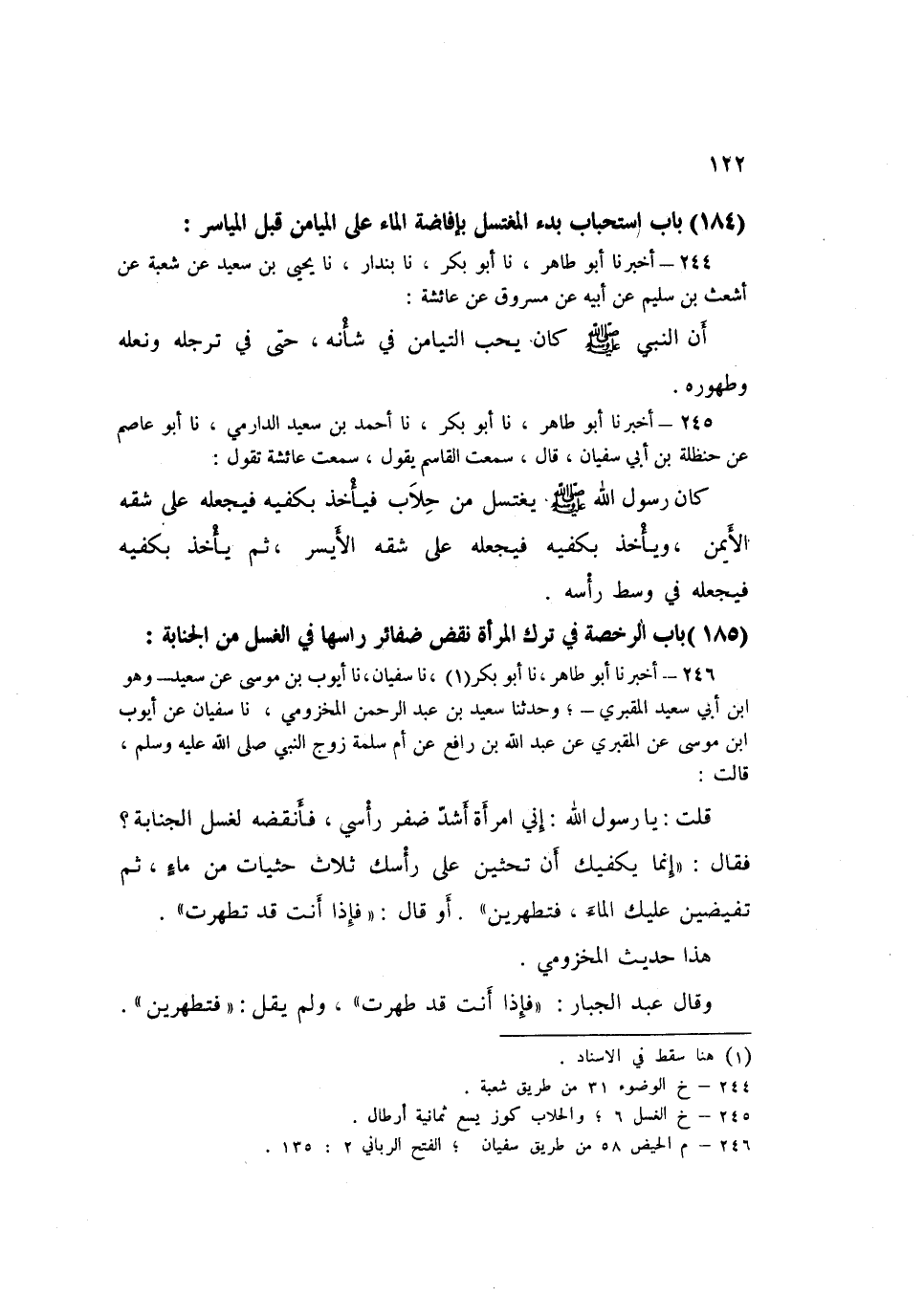246 - نا سُفْيَانُ، نا أَيُّوبُ بْنُ مُوسَى، عَنْ سَعِيدٍ وَهُوَ ابْنُ أَبِي سَعِيدٍ الْمَقْبُرِيُّ، وَحَدَّثَنَا سَعِيدُ بْنُ عَبْدِ الرَّحْمَنِ الْمَخْزُومِيُّ، نا سُفْيَانُ، عَنْ أَيُّوبَ بْنِ مُوسَى، عَنِ الْمَقْبُرِيِّ، عَنْ عَبْدِ اللَّهِ بْنِ رَافِعٍ، عَنْ أُمِّ سَلَمَةَ زَوْجِ النَّبِيِّ صَلَّى اللهُ عَلَيْهِ وَسَلَّمَ قَالَتْ: قُلْتُ يَا رَسُولَ اللَّهِ، إِنِّي امْرَأَةٌ أَشُدُّ ضَفْرَ رَأْسِي فَأَنْقُضُهُ لِغُسْلِ الْجَنَابَةِ؟ فَقَالَ: «إِنَّمَا §يَكْفِيكِ أَنْ تَحْثِينَ عَلَى رَأْسِكِ ثَلَاثَ حَثَيَاتٍ مِنْ مَاءٍ، ثُمَّ تُفِيضِينَ عَلَيْكِ الْمَاءَ فَتَطْهُرِينَ» أَوْ قَالَ: «فَإِذَا أَنْتِ قَدْ تَطَهَّرَتْ» . " هَذَا حَدِيثُ الْمَخْزُومِيُّ، وَقَالَ عَبْدُ الْجَبَّارِ: فَإِذَا أَنْتِ قَدْ طَهُرْتِ , وَلَمْ يَقُلْ: فَتَطْهُرِينَ "