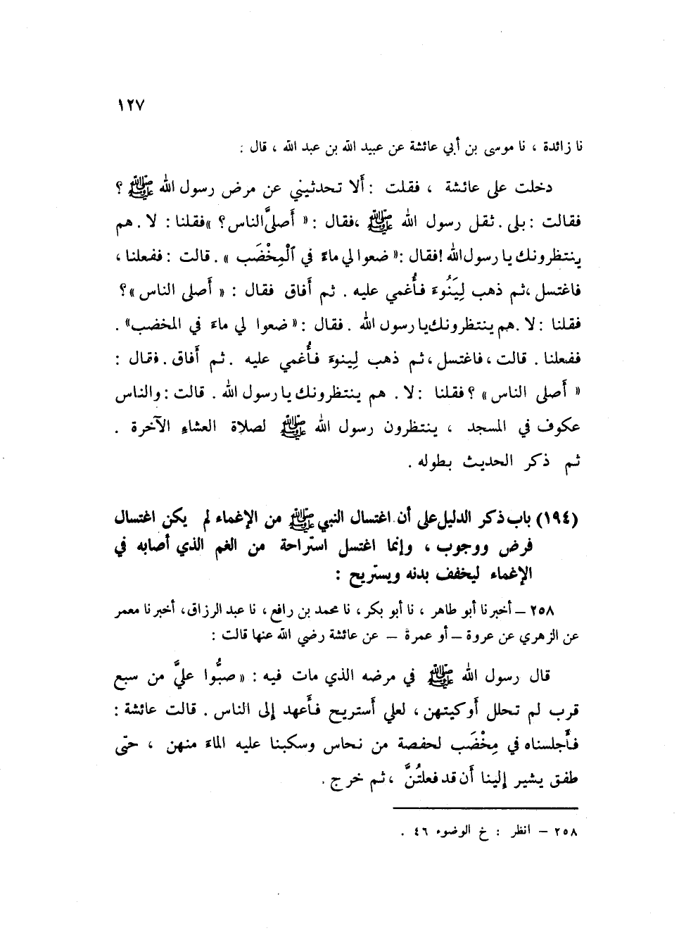 258 - نا مُحَمَّدُ بْنُ رَافِعٍ، نا عَبْدُ الرَّزَّاقِ، أَخْبَرَنَا مَعْمَرٌ، عَنِ الزُّهْرِيِّ، عَنْ عُرْوَةَ أَوْ عَمْرَةَ، عَنْ عَائِشَةَ رَضِي اللَّهُ عَنْهَا قَالَتْ: " قَالَ رَسُولُ اللَّهِ صَلَّى اللهُ عَلَيْهِ وَسَلَّمَ فِي مَرَضِهِ الَّذِي مَاتَ فِيهِ: §صُبُّوا عَلَيَّ مِنْ سَبْعِ قِرَبٍ لَمْ تُحْلَلْ أَوْكِيَتُهُنَّ لَعَلِّي أَسْتَرِيحُ فَأَعْهَدُ إِلَى النَّاسِ ". قَالَتْ عَائِشَةُ: فَأَجْلَسْنَاهُ فِي مِخْضَبٍ لِحَفْصَةَ مِنْ نُحَاسٍ , وَسَكَبْنَا عَلَيْهِ الْمَاءَ مِنْهُنَّ حَتَّى طَفِقَ يُشِيرُ إِلَيْنَا أَنْ قَدْ فَعَلْتُنَّ , ثُمَّ خَرَجَ نا بِهِ مُحَمَّدُ بْنُ يَحْيَى نَحْوَهُ وَقَالَ: سَمِعْتُ عَبْدَ الرَّزَّاقِ يَذْكُرُهُ، عَنْ مَعْمَرٍ، عَنِ الزُّهْرِيِّ، عَنْ عُرْوَةَ، عَنْ عَائِشَةَ نَحْوَهُ. غَيْرُ أَنَّهُ لَمْ يَقُلْ: «مِنْ نُحَاسٍ» حِينَ جَعَلَ الْحَدِيثَ، عَنْ عُرْوَةَ بِلَا شَكٍّ
