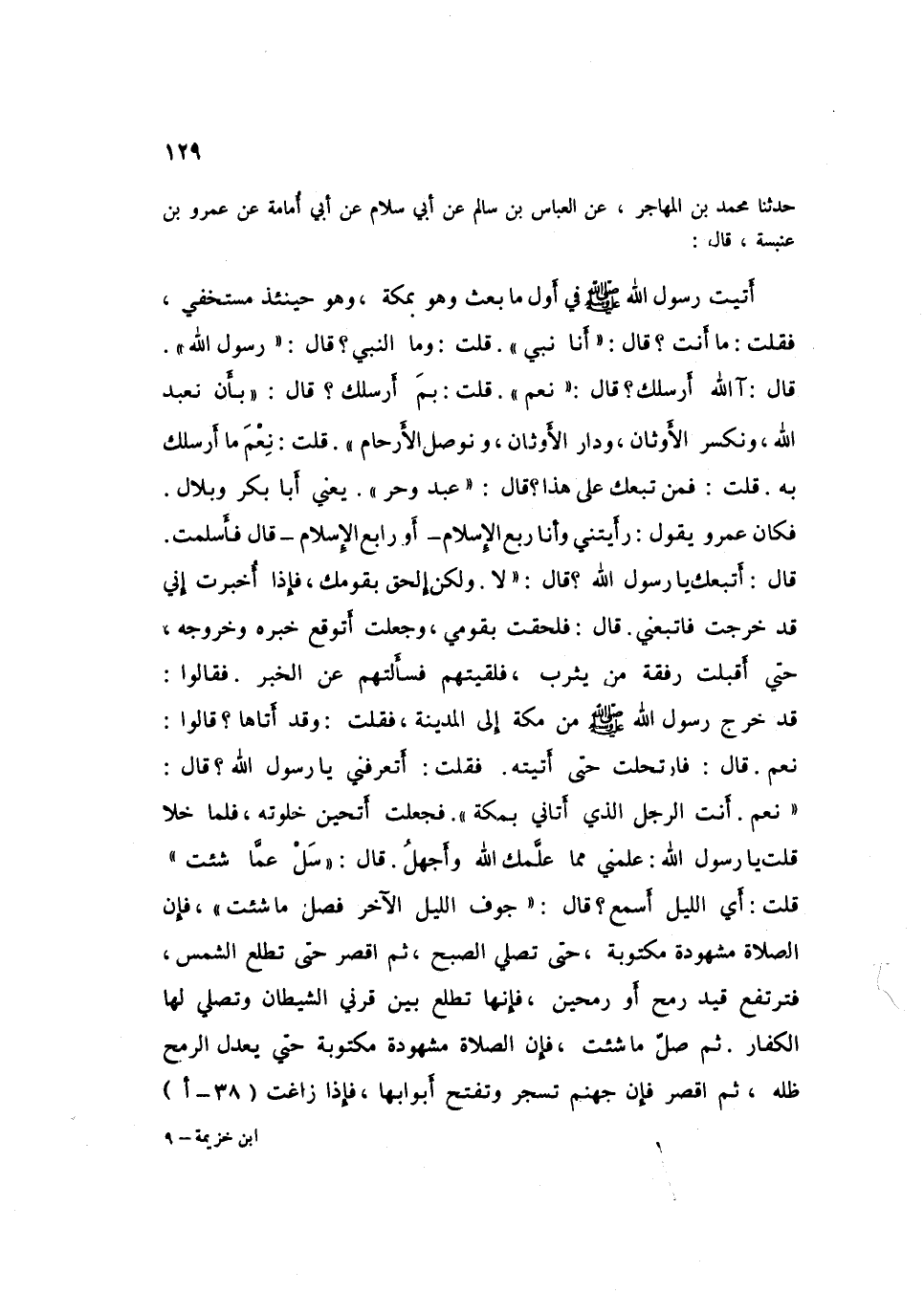 أَتَيْتُ رَسُولَ اللهِ صَلَّى اللَّهُ عَلَيْهِ وَسَلَّمَ فِي أَوَّلِ مَا بُعِثَ وَهُوَ بِمَكَّةَ ، وَهُوَ حِينَئِذٍ مُسْتَخْفٍ فَقُلْتُ مَا أَنْتَ ؟ قَالَ : أَنَا نَبِيٌّ. قُلْتُ : وَمَا النَّبِيُّ ؟ قَالَ : رَسُولُ اللهِ . ، قَالَ : آللَّهُ أَرْسَلَكَ ؟ قَالَ : نَعَمْ . قُلْتُ : بِمَ أَرْسَلَكَ ؟ قَالَ : بِأَنْ نَعْبُدَ اللَّهَ ، وَنُكَسِّرَ الأَوْثَانَ ، وَدَارَ الأَوْثَانِ ، وَنَوْصِلَ الأَرْحَامُ . قُلْتُ : نِعْمَ مَا أَرْسَلَكَ بِهِ ، قُلْتُ : فَمَنْ تَبِعَكَ عَلَى هَذَا ؟ قَالَ : عَبْدٌ وَحُرٌّ ، يَعْنِي أَبَا بَكْرٍ وَبِلاَلاً - فَكَانَ عَمْرٌو يَقُولُ : رَأَيْتُنِي وَأَنَا رُبْعُ الإِِسْلاَمِ ، أَوْ رَابِعُ الإِِسْلاَمِ - ، قَالَ : فَأَسْلَمْتُ ، قَالَ : أَتَّبِعُكَ يَا رَسُولَ اللهِ ، قَالَ : لاَ ، وَلَكِنِ الْحَقْ بِقَوْمِكَ فَإِذَا أُخْبِرْتَ أَنِّي قَدْ خَرَجْتُ فَاتَّبِعْنِي ، قَالَ : فَلَحِقْتُ بِقَوْمِي , وَجَعَلْتُ أَتَوَقَّعُ خَبَرَهُ وَخُرُوجَهُ حَتَّى أَقْبَلَتْ رُفْقَةٌ مِنْ يَثْرِبَ ، فَلَقِيتُهُمْ فَسَأَلْتُهُمْ عَنِ الْخَبَرِ ، فَقَالُوا : قَدْ خَرَجَ رَسُولُ اللهِ صَلَّى اللَّهُ عَلَيْهِ وَسَلَّمَ مِنْ مَكَّةَ إِلَى الْمَدِينَةِ ، فَقُلْتُ : وَقَدْ أَتَاهَا ؟ قَالُوا : نَعَمْ ، قَالَ : فَارْتَحَلَتْ حَتَّى أَتَيْتُهُ ، فَقُلْتُ : أَتَعْرِفُنِي يَا رَسُولَ اللهِ ؟ قَالَ : نَعَمْ أَنْتَ الرَّجُلُ الَّذِي أَتَانِي بِمَكَّةَ فَجَعَلْتُ أَتَحَيَّنُ خَلْوَتَهُ ، فَلَمَّا خَلاَ قُلْتُ : يَا رَسُولَ اللهِ ، عَلِّمْنِي مِمَّا عَلَّمَكَ اللَّهُ وَأَجْهَلُ . ، قَالَ : سَلْ عَمَّا شِئْتَ . قُلْتُ : أَيُّ اللَّيْلِ أَسْمَعُ ؟ قَالَ : جَوْفُ اللَّيْلِ الآخِرِ ، فَصَلِّ مَا شِئْتَ ؛ فَإِنَّ الصَّلاَةَ مَشْهُودَةٌ مَكْتُوبَةٌ حَتَّى تُصَلِّيَ الصُّبْحَ ، ثُمَّ أَقْصِرْ حَتَّى تَطْلُعَ الشَّمْسُ فَتَرْتَفِعُ قَيدْ رُمْحٍ ، أَوْ رُمْحَيْنِ ، فَإِنَّهَا تَطْلُعُ بَيْنَ قَرْنَيِ الشَّيْطَانِ ، وَتُصَلِّي لَهَا الْكُفَّارُ ، ثُمَّ صَلِّ مَا شِئْتَ ، فَإِنَّ الصَّلاَةَ مَشْهُودَةٌ مَكْتُوبَةٌ حَتَّى يَعْدِلَ الرُّمْحَ ظِلُّهُ ، ثُمَّ أَقْصِرْ ، فَإِنَّ جَهَنَّمَ تُسْجَرُ وَتُفْتَحُ أَبْوَابُهَا ، فَإِذَا زَاغَتِ الشَّمْسُ فَصَلِّ مَا شِئْتَ ؛