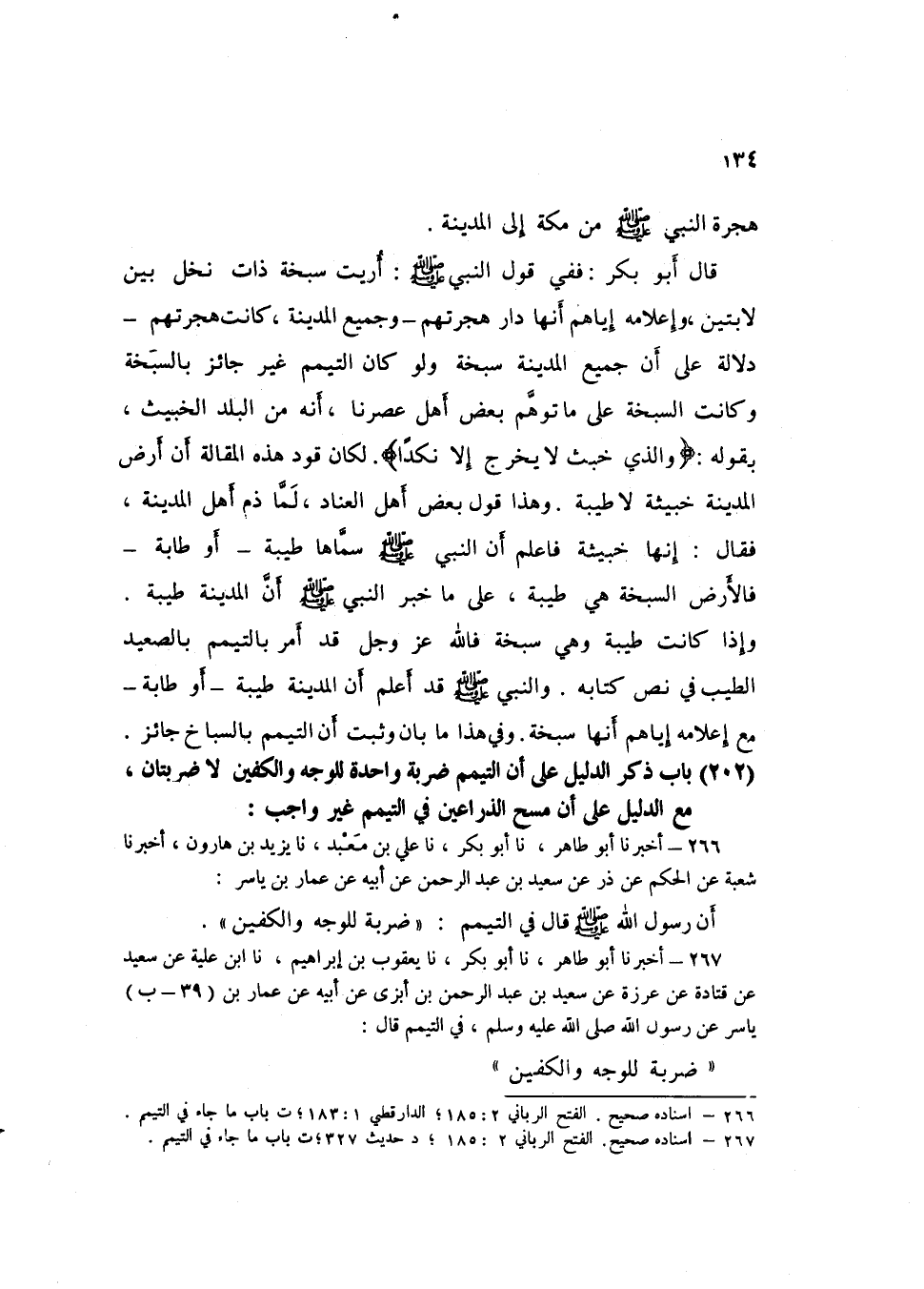 267 - نا يَعْقُوبُ بْنُ إِبْرَاهِيمَ، نا ابْنُ عُلَيَّةَ، عَنْ سَعِيدٍ، عَنْ قَتَادَةَ، عَنْ عَرَزَةَ، عَنْ سَعِيدِ بْنِ عَبْدِ الرَّحْمَنِ بْنِ أَبْزَى، عَنْ أَبِيهِ، عَنْ عَمَّارِ بْنِ يَاسِرٍ، عَنْ رَسُولِ اللَّهِ صَلَّى اللهُ عَلَيْهِ وَسَلَّمَ فِي التَّيَمُّمِ قَالَ: «§ضَرْبَةٌ لِلْوَجْهِ وَالْكَفَّيْنِ» K267 - قال الأعظمي: إسناده صحيح