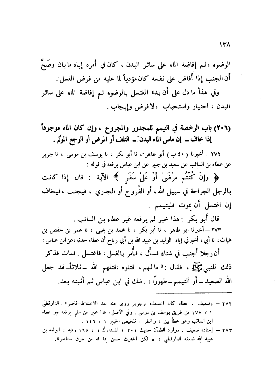 273 - نا مُحَمَّدُ بْنُ يَحْيَى، نا عُمَرُ بْنُ حَفْصِ بْنِ غِيَاثٍ، نا أَبِي، أَخْبَرَنِي إِيَّاهُ الْوَلِيدُ بْنُ عُبَيْدِ اللَّهِ بْنِ أَبِي رَبَاحٍ، أَنَّ عَطَاءً حَدَّثَهُ، عَنِ ابْنِ عَبَّاسٍ، أَنَّ رَجُلًا أَجْنَبَ فِي شِتَاءٍ فَسَأَلَ فَأُمِرَ بِالْغُسْلِ، فَاغْتَسَلَ فَمَاتَ، فَذُكِرَ ذَلِكَ لِلنَّبِيِّ صَلَّى اللهُ عَلَيْهِ وَسَلَّمَ فَقَالَ: «مَا لَهُمْ؟ قَتَلُوهُ قَتَلَهُمُ اللَّهُ - ثَلَاثًا - §قَدْ جَعَلَ اللَّهُ الصَّعِيدَ أَوِ التَّيَمُّمَ طَهُورًا» شَكَّ فِي ابْنِ عَبَّاسٍ، ثُمَّ أَثْبَتَهُ بَعْدُ "K273 - قال الأعظمي: إسناده ضعيف الوليد بن عبيد الله ضعفه الدارقطني