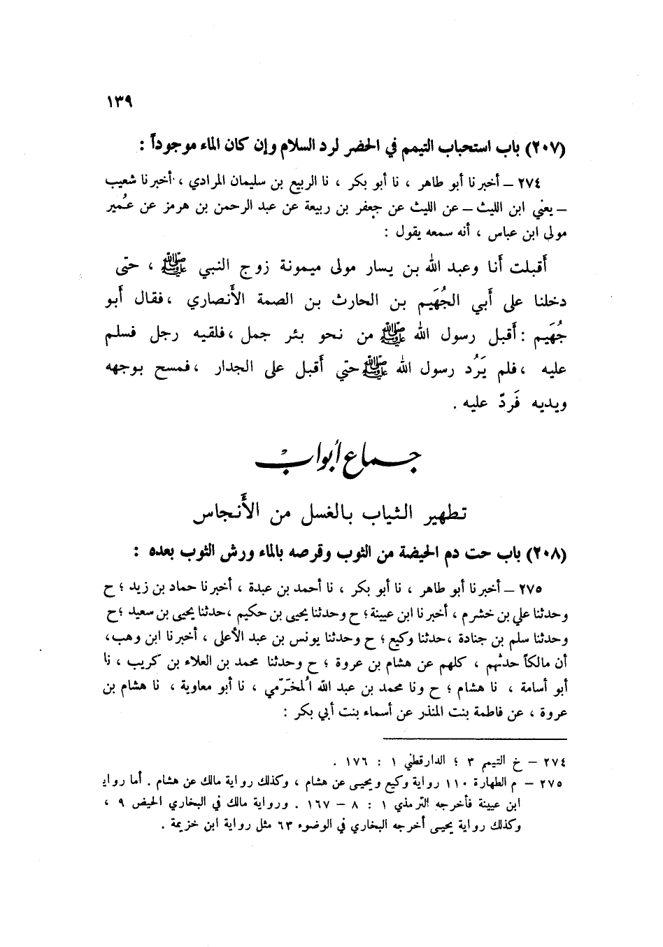 274 - نا الرَّبِيعُ بْنُ سُلَيْمَانَ الْمُرَادِيُّ، أَخْبَرَنَا شُعَيْبٌ يَعْنِي ابْنَ اللَّيْثِ، عَنِ اللَّيْثِ، عَنْ جَعْفَرِ بْنِ رَبِيعَةَ، عَنْ عَبْدِ الرَّحْمَنِ بْنِ هُرْمُزَ، عَنْ عُمَيْرٍ مَوْلَى ابْنِ عَبَّاسٍ أَنَّهُ سَمِعَهُ يَقُولُ: أَقْبَلْتُ أَنَا وَعَبْدُ اللَّهِ بْنُ يَسَارٍ مَوْلَى مَيْمُونَةَ زَوْجِ النَّبِيِّ صَلَّى اللهُ عَلَيْهِ وَسَلَّمَ حَتَّى دَخَلْنَا عَلَى أَبِي الْجُهَيْمِ بْنِ الْحَارِثِ بْنِ الصِّمَّةِ الْأَنْصَارِيِّ، فَقَالَ أَبُو جُهَيْمٍ: «أَقْبَلَ رَسُولُ اللَّهِ صَلَّى اللهُ عَلَيْهِ وَسَلَّمَ مِنْ نَحْوِ بِئْرِ جَمَلٍ، فَلَقِيَهُ رَجُلٌ فَسَلَّمَ عَلَيْهِ، §فَلَمْ يَرُدَّ رَسُولُ اللَّهِ صَلَّى اللهُ عَلَيْهِ وَسَلَّمَ حَتَّى أَقْبَلَ عَلَى الْجِدَارِ، فَمَسَحَ بِوَجْهِهِ وَيَدَيْهِ فَرَدَّ عَلَيْهِ»