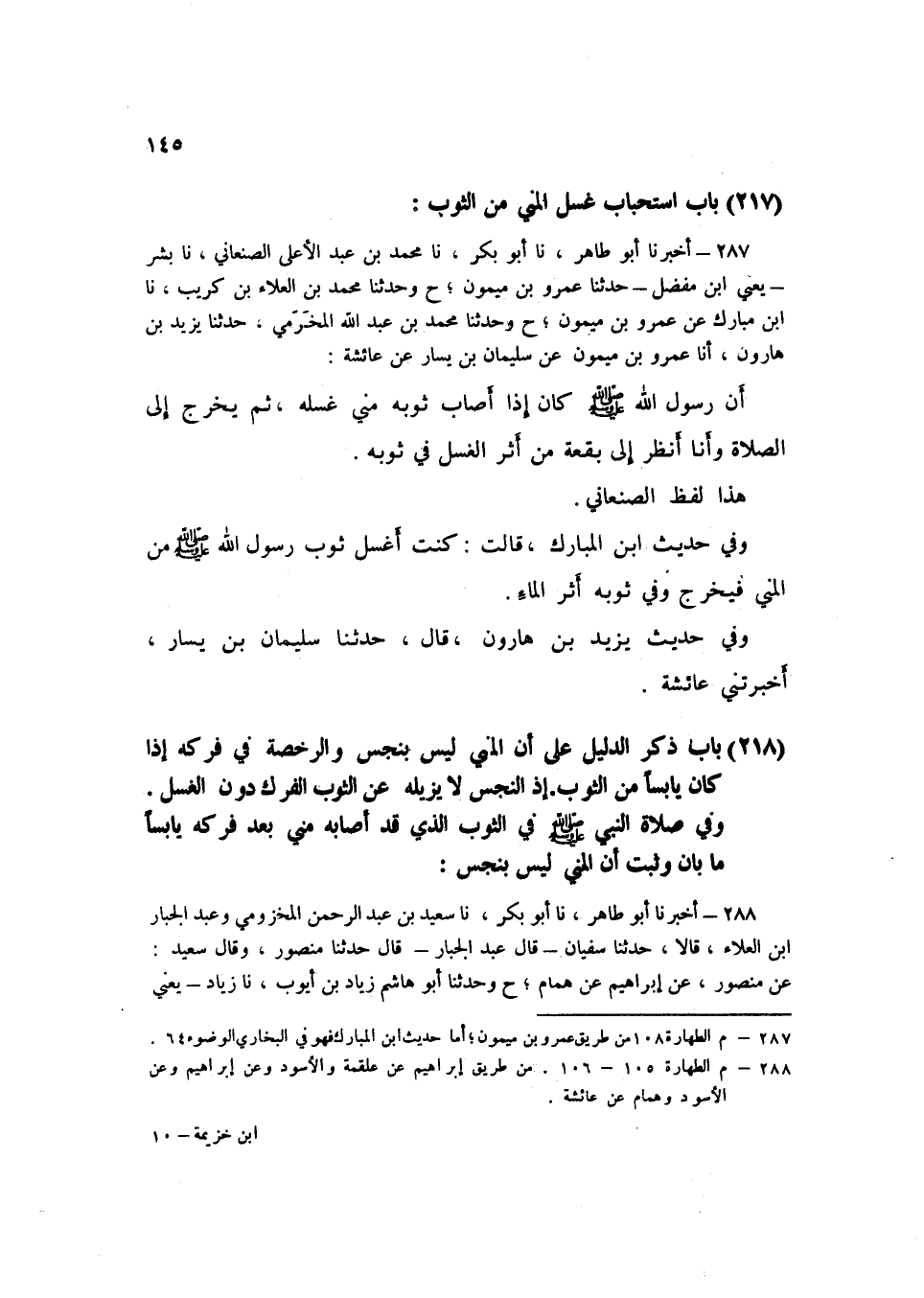 287 - نا مُحَمَّدُ بْنُ عَبْدِ الْأَعْلَى الصَّنْعَانِيُّ، نا بِشْرٌ يَعْنِي ابْنَ مُفَضَّلٍ، حَدَّثَنَا عَمْرُو بْنُ مَيْمُونٍ، ح وَحَدَّثَنَا مُحَمَّدُ بْنُ الْعَلَاءِ بْنُ كُرَيْبٍ، نا ابْنُ مُبَارَكٍ، عَنْ عَمْرِو بْنِ مَيْمُونٍ، ح وَحَدَّثَنَا مُحَمَّدُ بْنُ عَبْدِ اللَّهِ الْمُخَرَّمِيُّ، حَدَّثَنَا يَزِيدُ بْنُ هَارُونَ، أنا عَمْرُو بْنُ مَيْمُونٍ، عَنْ سُلَيْمَانَ بْنِ يَسَارٍ، عَنْ عَائِشَةَ، «أَنَّ رَسُولَ اللَّهِ صَلَّى اللهُ عَلَيْهِ وَسَلَّمَ كَانَ §إِذَا أَصَابَ ثَوْبَهُ مَنِيُّ غَسَلَهُ، ثُمَّ يَخْرُجُ إِلَى الصَّلَاةِ» وَأَنَا أَنْظُرُ إِلَى بُقْعَةٍ مِنْ أَثَرِ الْغَسْلِ فِي ثَوْبِهِ «هَذَا لَفْظُ الصَّنْعَانِيِّ» وَفِي حَدِيثِ ابْنِ الْمُبَارَكِ قَالَتْ: «كُنْتُ أَغْسِلُ ثَوْبَ رَسُولِ اللَّهِ صَلَّى اللهُ عَلَيْهِ وَسَلَّمَ مِنَ الْمَنِيِّ، فَيَخْرُجُ وَفِي ثَوْبِهِ أَثَرُ الْمَاءِ» . وَفِي حَدِيثِ يَزِيدَ بْنِ هَارُونَ قَالَ: حَدَّثَنَا سُلَيْمَانُ بْنُ يَسَارٍ، أَخْبَرَتْنِي عَائِشَةُ