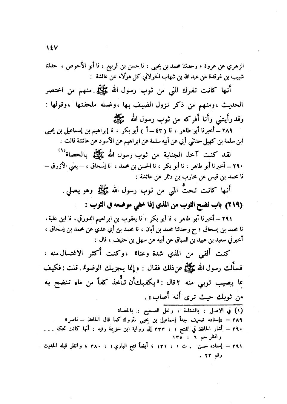 290 - نا الْحَسَنُ بْنُ مُحَمَّدٍ، نا إِسْحَاقُ يَعْنِي الْأَزْرَقَ، نا مُحَمَّدُ بْنُ قَيْسٍ، عَنْ مُحَارِبِ بْنِ دِثَارٍ، عَنْ عَائِشَةَ، «أَنَّهَا كَانَتْ §تَحُتُّ الْمَنِيَّ مِنْ ثَوْبِ رَسُولِ اللَّهِ صَلَّى اللهُ عَلَيْهِ وَسَلَّمَ وَهُوَ يُصَلِّي»