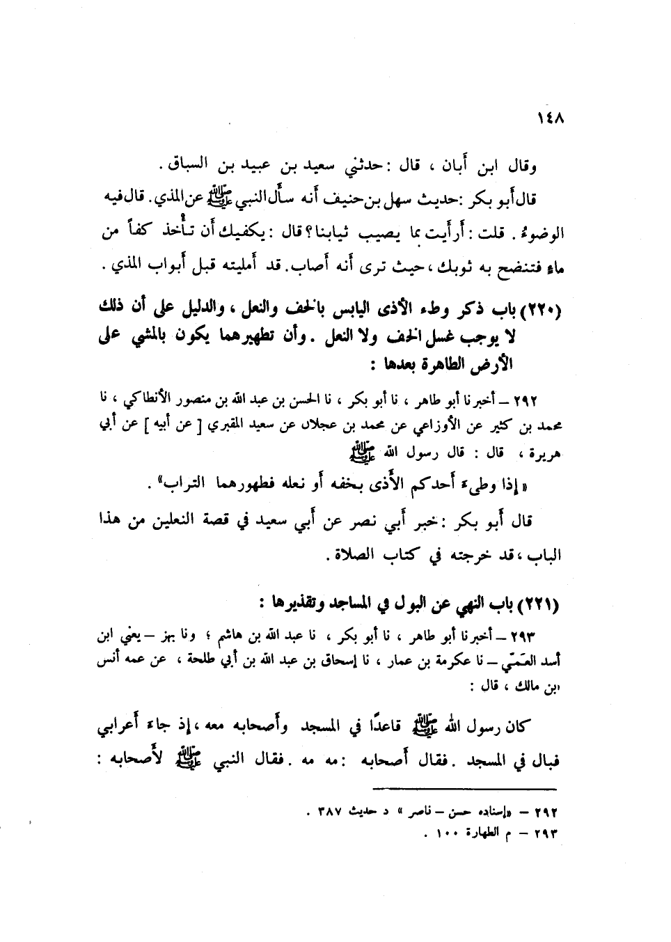 292 - نا الْحَسَنُ بْنُ عَبْدِ اللَّهِ بْنِ مَنْصُورٍ الْأَنْطَاكِيُّ، نا مُحَمَّدُ بْنُ كَثِيرٍ، عَنِ الْأَوْزَاعِيِّ، عَنْ مُحَمَّدِ بْنِ عَجْلَانَ، عَنْ سَعِيدٍ الْمَقْبُرِيِّ، عَنْ أَبِيهِ، عَنْ أَبِي هُرَيْرَةَ قَالَ: قَالَ رَسُولُ اللَّهِ صَلَّى اللهُ عَلَيْهِ وَسَلَّمَ: «§إِذَا وَطِئَ أَحَدُكُمُ الْأَذَى بِخُفِّهِ أَوْ نَعْلِهِ فَطَهُورُهُمَا التُّرَابُ» قَالَ أَبُو بَكْرٍ: «خَبَرُ أَبِي نَصْرٍ، عَنْ أَبِي سَعِيدٍ فِي قِصَّةِ النَّعْلَيْنِ مِنْ هَذَا الْبَابِ قَدْ خَرَّجْتُهُ فِي كِتَابِ الصَّلَاةِ» K292 - قال الألباني: إسناده حسن