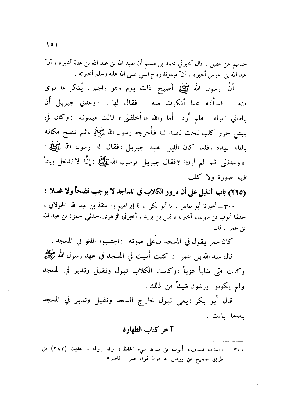 300 - نا إِبْرَاهِيمُ بْنُ مُنْقِذِ بْنِ عَبْدِ اللَّهِ الْخَوْلَانِيُّ، حَدَّثَنَا أَيُّوبُ بْنُ سُوَيْدٍ، أَخْبَرَنَا يُونُسُ بْنُ يَزِيدَ، أَخْبَرَنِي الزُّهْرِيُّ، حَدَّثَنِي حَمْزَةُ بْنُ عَبْدِ اللَّهِ بْنِ عُمَرَ قَالَ: كَانَ عُمَرُ يَقُولُ فِي الْمَسْجِدِ بِأَعْلَى صَوْتِهِ: «§اجْتَنِبُوا اللَّغْوَ فِي الْمَسْجِدِ» قَالَ عَبْدُ اللَّهِ بْنُ عُمَرَ: «كُنْتُ أَبِيتُ فِي الْمَسْجِدِ فِي عَهْدِ رَسُولِ اللَّهِ صَلَّى اللهُ عَلَيْهِ وَسَلَّمَ، وَكُنْتُ فَتًى شَابًّا عَزَبًا، وَكَانَتِ الْكِلَابُ تَبُولُ وَتُقْبِلُ، وَتُدْبِرُ فِي الْمَسْجِدِ، وَلَمْ يَكُونُوا يَرُشُّونَ شَيْئًا مِنْ ذَلِكَ» قَالَ أَبُو بَكْرٍ: «يَعْنِي تَبُولُ خَارِجَ الْمَسْجِدِ، وَتُقْبِلُ وَتُدْبِرُ فِي الْمَسْجِدِ بَعْدَمَا بَالَتْ» K300 - قال الألباني: إسناده ضعيف أيوب بن سويد سيئ الحفظ وقد رواه أبو داود 382 من طريق صحيح عن يونس به دون قول عمر