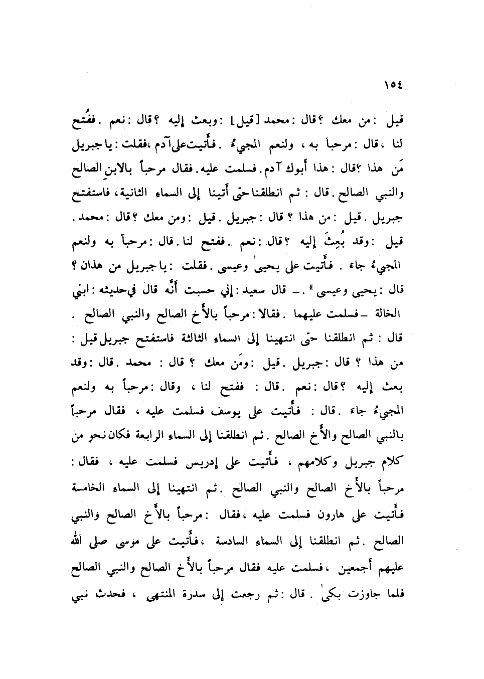 فَفُتِحَ لَنَا ، قَالَ : مَرْحَبًا بِهِ وَلَنِعْمَ الْمَجِيءُ ، فَأَتَيْتُ عَلَى آدَمَ ، فَقُلْتُ : يَا جِبْرِيلُ مَنْ هَذَا ؟ قَالَ : هَذَا أَبُوكَ آدَمُ ، فَسَلَّمْتُ عَلَيْهِ ، فَقَالَ : مَرْحَبًا بِالاِبْنِ الصَّالِحِ وَالنَّبِيِّ الصَّالِحِ . ، قَالَ : ثُمَّ انْطَلَقْنَا حَتَّى أَتَيْنَا إِلَى السَّمَاءِ الثَّانِيَةِ فَاسْتَفْتَحَ جِبْرِيلُ قِيلَ : مَنْ هَذَا ؟ قَالَ : جِبْرِيلُ : قِيلَ : وَمَنْ مَعَكَ ؟ قَالَ : مُحَمَّدٌ ، قِيلَ : وَقَدْ بُعِثَ إِلَيْهِ ؟ قَالَ : نَعَمْ ، فَفُتِحَ لَنَا ، قَالَ : مَرْحَبًا بِهِ وَلَنِعْمَ الْمَجِيءُ جَاءَ ، فَأَتَيْتُ عَلَى يَحْيَى ، وَعِيسَى فَقُلْتُ : يَا جِبْرِيلُ مَنْ هَذَانِ ؟ قَالَ : يَحْيَى ، وَعِيسَى - ، قَالَ : سَعِيدٌ : إِنِّي حَسِبْتُ أَنَّهُ ، قَالَ : فِي حَدِيثِهِ : ابْنَيِ الْخَالَةِ - فَسَلَّمْتُ عَلَيْهِمَا فَقَالاَ : مَرْحَبًا بِالأَخِ الصَّالِحِ وَالنَّبِيِّ الصَّالِحِ . ، قَالَ : ثُمَّ انْطَلَقْنَا حَتَّى انْتَهَيْنَا إِلَى السَّمَاءِ الثَّالِثَةِ ، فَاسْتَفْتَحَ جِبْرِيلُ قِيلَ : مَنْ هَذَا ؟ قَالَ : جِبْرِيلُ : قِيلَ : وَمَنْ مَعَكَ ؟ قَالَ : مُحَمَّدٌ ، قَالَ : وَقَدْ بُعِثَ إِلَيْهِ ؟ قَالَ : نَعَمْ ، قَالَ : فَفُتِحَ لَنَا ، وَقَالَ : مَرْحَبًا بِهِ وَلَنِعْمَ الْمَجِيءُ جَاءَ ، قَالَ : فَأَتَيْتُ عَلَى يُوسُفَ ، فَسَلَّمْتُ عَلَيْهِ ، فَقَالَ : مَرْحَبًا بِالنَّبِيِّ الصَّالِحِ وَالأَخِ الصَّالِحِ ، ثُمَّ انْطَلِقَنا إِلَى السَّمَاءِ الرَّابِعَةِ ، فَكَانَ نَحْوٌ مَنْ كَلاَمِ جِبْرِيلَ وَكَلاَمِهِمْ ، فَأَتَيْتُ عَلَى إِدْرِيسَ فَسَلَّمْتُ عَلَيْهِ ، فَقَالَ : مَرْحَبًا بِالأَخِ الصَّالِحِ وَالنَّبِيِّ الصَّالِحِ ، ثُمَّ انْتَهَيْنَا إِلَى السَّمَاءِ الْخَامِسَةِ ، فَأَتَيْتُ عَلَى هَارُونَ فَسَلَّمْتُ عَلَيْهِ ، فَقَالَ : مَرْحَبًا بِالأَخِ الصَّالِحِ وَالنَّبِيِّ الصَّالِحِ ، ثُمَّ انْطَلَقْنَا إِلَى السَّمَاءِ السَّادِسَةِ ، فَأَتَيْتُ عَلَى مُوسَى صَلَّى اللَّهُ عَلَيْهِمْ أَجْمَعِينَ فَسَلَّمْتُ عَلَيْهِ ، فَقَالَ مَرْحَبًا بِالأَخِ الصَّالِحِ وَالنَّبِيِّ الصَّالِحِ ، فَلَمَّا جَاوَزْتُ بَكَى ، قَالَ : ثُمَّ رَجَعْتُ إِلَى سِدْرَةِ الْمُنْتَهَى ، فَحَدَّثَ نَبِيُّ اللهِ صَلَّى اللَّهُ عَلَيْهِ وَسَلَّمَ أَنَّ نَبْقَهَا مِثْلُ قِلاَلِ هَجَرَ وَوَرَقَهَا مِثْلُ آذَانِ الْفِيَلَةِ ،