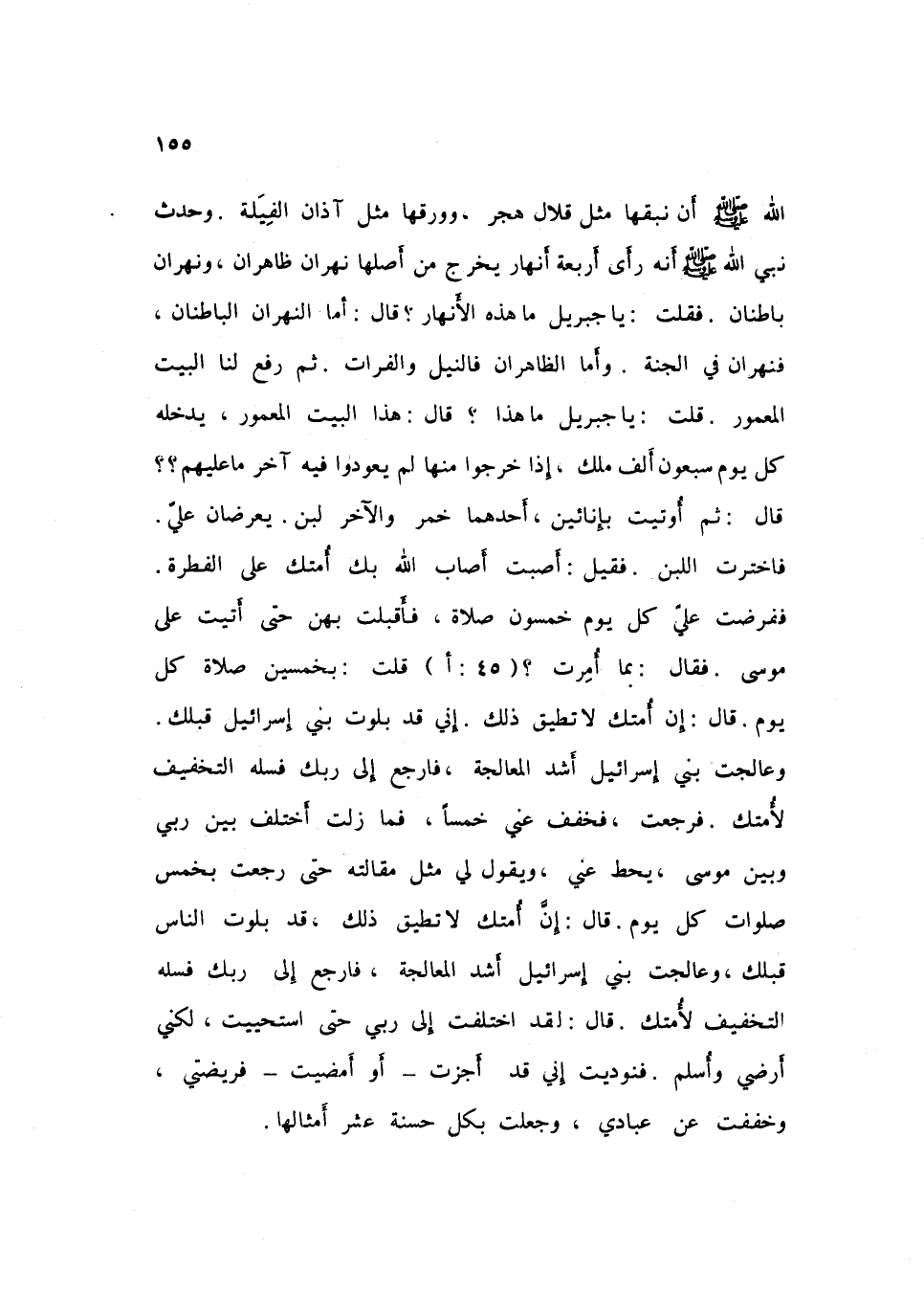 وَحَدَّثَ نَبِيُّ اللهِ صَلَّى اللَّهُ عَلَيْهِ وَسَلَّمَ أَنَّهُ رَأَى أَرْبَعَةَ أَنْهَارٍ يَخْرُجُ مَنْ أَصْلِهَا نَهْرَانِ ظَاهِرَانِ وَنَهْرَانِ بَاطِنَانِ ، فَقُلْتُ : يَا جِبْرِيلُ مَا هَذِهِ الأَنْهَارُ ؟ قَالَ : أَمَّا النَّهَرَانِ الْبَاطِنانِ ، فَنَهْرَانِ فِي الْجَنَّةِ ، وَأَمَّا الظَّاهِرَانِ : فَالنِّيلُ وَالْفُرَاتُ ، ثُمَّ رُفِعَ لَنَا الْبَيْتُ الْمَعْمُورُ ، قُلْتُ : يَا جِبْرِيلُ مَا هَذَا ؟ قَالَ : هَذَا الْبَيْتُ الْمَعْمُورُ يَدْخُلُهُ كُلَّ يَوْمٍ سَبْعُونَ أَلْفَ مَلِكٍ إِذَا خَرَجُوا مِنْهَا لَمْ يَعُودُوا فِيهِ آخِرَ مَا عَلَيْهِمْ ، قَالَ : ثُمَّ أُوتِيتُ بِإِنَاءَيْنِ أَحَدُهُمَا خَمْرٌ ، وَالآخَرُ لَبَنٌ يُعْرَضَانِ عَلَيَّ ، فَاخْتَرْتُ اللَّبَنَ ، فَقِيلَ : أَصَبْتَ أَصَابَ اللَّهُ بِكَ أُمَّتَكَ عَلَى الْفِطْرَةِ ، فَفُرِضَتْ عَلَيَّ كُلَّ يَوْمٍ خَمْسُونَ صَلاَةً فَأَقْبَلْتُ بِهِنَّ حَتَّى أَتَيْتُ عَلَى مُوسَى فَقَالَ : بِمَا أُمِرْتَ ؟ قُلْتُ : بِخَمْسِينَ صَلاَةً كُلَّ يَوْمٍ ، قَالَ : إِنَّ أُمَّتَكَ لاَ تُطِيقُ ذَلِكَ إِنِّي قَدْ بَلَوْتُ بَنِي إِسْرَائِيلَ قَبْلَكَ ، وَعَالَجْتُ بَنِي إِسْرَائِيلَ أَشَدَّ الْمُعَالَجَةِ فَارْجِعْ إِلَى رَبِّكَ ، فَسَلْهُ التَّخْفِيفَ لأُمَّتِكَ فَرَجَعْتُ ، فَخَفَّفَ عَنِّي خَمْسًا فَمَا زِلْتُ أَخْتَلِفُ بَيْنَ رَبِّي وَبَيْنَ مُوسَى يَحُطُّ عَنِّي وَيَقُولُ لِي مِثْلَ مَقَالَتِهِ حَتَّى رَجَعْتُ بِخَمْسِ صَلَوَاتٍ كُلَّ يَوْمٍ ، قَالَ : إِنَّ أُمَّتَكَ لاَ تُطِيقُ ذَلِكَ قَدْ بَلَوْتُ النَّاسَ قَبْلَكَ وَعَالَجْتُ بَنِي إِسْرَائِيلَ أَشَدَّ الْمُعَالَجَةِ ، فَارْجِعْ إِلَى رَبِّكَ فَسَلْهُ التَّخْفِيفَ لأُمَّتِكَ . ، قَالَ : لَقَدِ اخْتَلَفْتُ إِلَى رَبِّي حَتَّى اسْتَحْيَيْتُ لَكِنِّي أَرْضَى وَأُسَلِّمُ ، فَنُودِيتُ إِنِّي قَدْ أَجَزْتُ ، أَوْ أَمْضَيْتُ فَرِيضَتِي وَخَفَّفْتُ عَنْ عِبَادِي وَجَعَلْتُ بِكُلِّ حَسَنَةٍ عَشْرَ أَمْثَالِهَا.