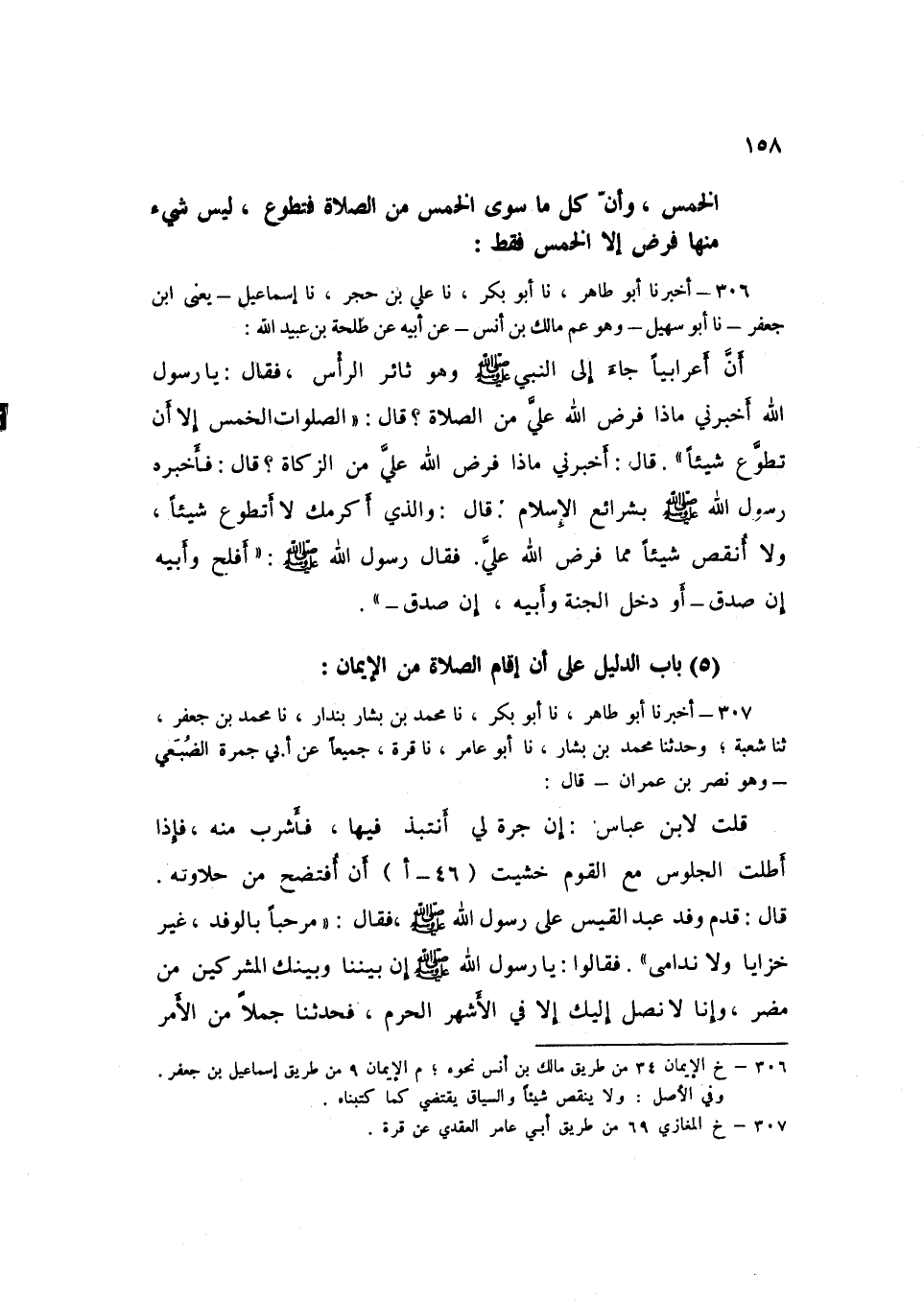 306 - نا عَلِيُّ بْنُ حُجْرٍ، نا إِسْمَاعِيلُ يَعْنِي ابْنَ جَعْفَرٍ، نا أَبُو سُهَيْلٍ وَهُوَ عَمُّ مَالِكِ بْنِ أَنَسٍ، عَنْ أَبِيهِ، عَنْ طَلْحَةَ بْنِ عُبَيْدِ اللَّهِ، أَنَّ أَعْرَابِيًّا جَاءَ إِلَى النَّبِيِّ صَلَّى اللهُ عَلَيْهِ وَسَلَّمَ وَهُوَ ثَائِرُ الرَّأْسِ، فَقَالَ: يَا رَسُولَ اللَّهِ، أَخْبِرْنِي §مَاذَا فَرَضَ اللَّهُ عَلَيَّ مِنَ الصَّلَاةِ؟ قَالَ: «الصَّلَوَاتُ الْخَمْسُ إِلَّا أَنْ تَطَوَّعَ شَيْئًا» قَالَ: أَخْبِرْنِي مَاذَا فَرَضَ اللَّهُ عَلَيَّ مِنَ الزَّكَاةِ؟ قَالَ: فَأَخْبَرَهُ رَسُولُ اللَّهِ صَلَّى اللهُ عَلَيْهِ وَسَلَّمَ بِشَرَائِعِ الْإِسْلَامِ قَالَ: وَالَّذِي أَكْرَمَكَ لَا أَتَطَوَّعُ شَيْئًا، وَلَا أُنْقِصُ شَيْئًا مِمَّا فَرَضَ اللَّهُ عَلَيَّ، فَقَالَ رَسُولُ اللَّهِ صَلَّى اللهُ عَلَيْهِ وَسَلَّمَ: «أَفْلَحَ وَأَبِيهِ إِنْ صَدَقَ» أَوْ «دَخَلَ الْجَنَّةَ وَأَبِيهِ إِنْ صَدَقَ»