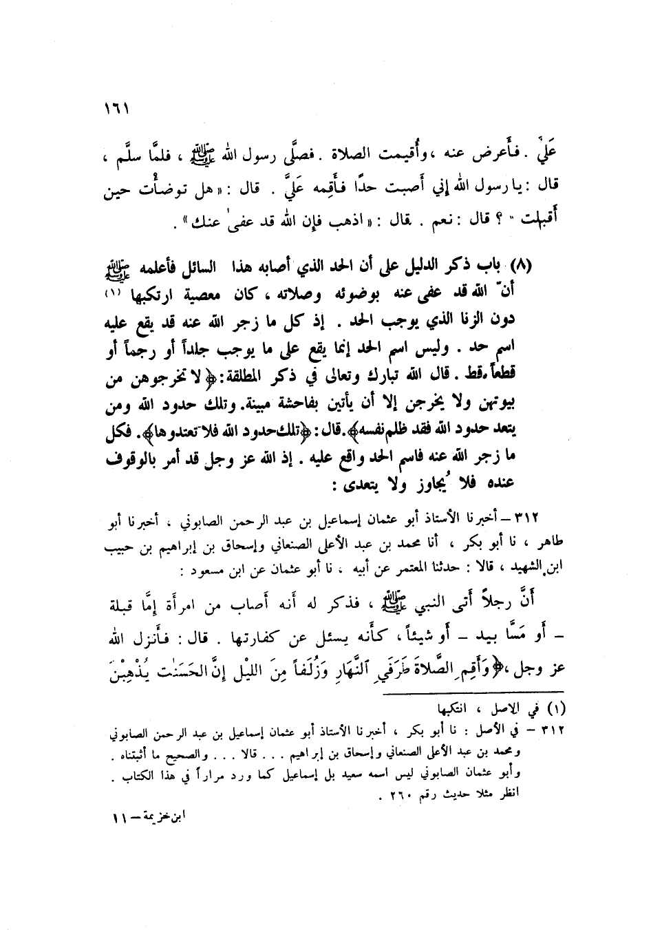 312 - أنا مُحَمَّدُ بْنُ عَبْدِ الْأَعْلَى الصَّنْعَانِيُّ، وَإِسْحَاقُ بْنُ إِبْرَاهِيمَ بْنِ حَبِيبِ بْنِ الشَّهِيدِ قَالَا: حَدَّثَنَا الْمُعْتَمِرُ، عَنْ أَبِيهِ، نا أَبُو عُثْمَانَ، عَنِ ابْنُ مَسْعُودٍ، أَنَّ رَجُلًا أَتَى النَّبِيَّ صَلَّى اللهُ عَلَيْهِ وَسَلَّمَ، فَذَكَرَ لَهُ أَنَّهُ §أَصَابَ مِنَ امْرَأَةٍ إِمَّا قُبْلَةً، أَوْ مَسًّا بَيْدٍ، أَوْ شَيْئًا كَأَنَّهُ يَسْأَلُ عَنْ كَفَّارَتِهَا قَالَ: فَأَنْزَلَ اللَّهُ عَزَّ وَجَلَّ: {وَأَقِمِ الصَّلَاةَ طَرَفَيِ النَّهَارِ وَزُلَفًا مِنَ اللَّيْلِ، إِنَّ الْحَسَنَاتِ يُذْهِبْنَ السَّيِّئَاتِ ذَلِكَ ذِكْرَى لِلذَّاكِرِينَ} [هود: 114] قَالَ: فَقَالَ الرَّجُلُ: أَلِي هَذِهِ؟ قَالَ: «هِيَ لِمَنْ عَمِلَ بِهَا مِنْ أُمَّتِي» قَالَ: وَحَدَّثَنَاهُ الصَّنْعَانِيُّ، حَدَّثَنَا يَزِيدَ بْنُ زُرَيْعٍ، حَدَّثَنَا سُلَيْمَانُ وَهُوَ التَّمِيمِيُّ بِهَذَا الْإِسْنَادِ مِثْلَهُ، فَقَالَ: أَصَابَ مِنَ امْرَأَةٍ قُبْلَةً وَلَمْ يَشُكَّ، وَلَمْ يَقُلْ كَأَنَّهُ يَسْأَلُ عَنْ كَفَّارَتِهَا