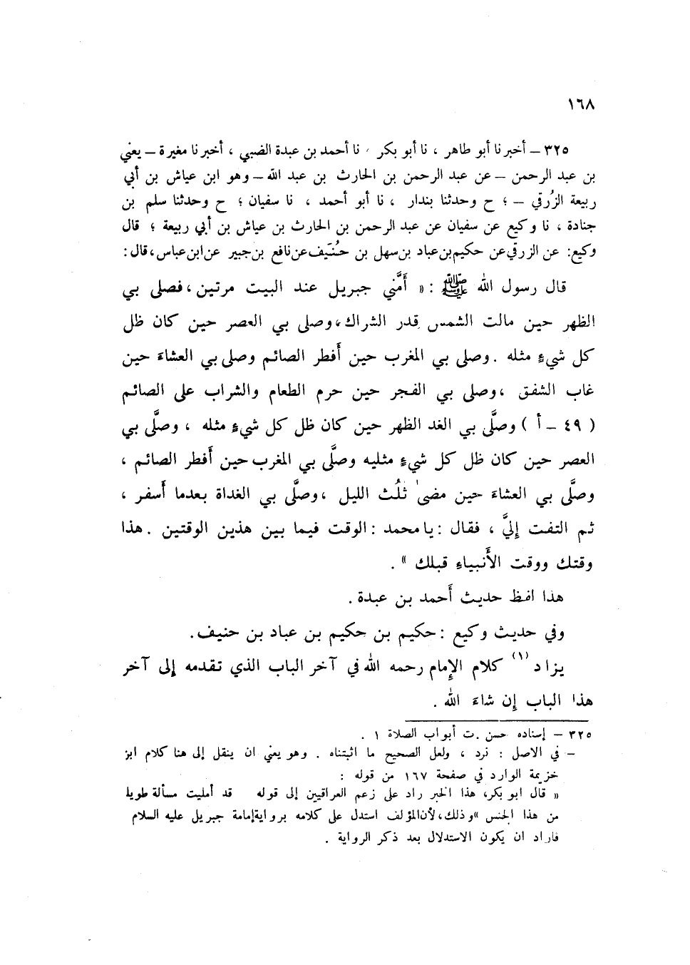 325 - نا أَحْمَدُ بْنُ عَبْدَةَ الضَّبِّيُّ، أَخْبَرَنَا مُغِيرَةُ يَعْنِي ابْنَ عَبْدِ الرَّحْمَنِ، عَنْ عَبْدِ الرَّحْمَنِ بْنِ الْحَارِثِ بْنِ عَبْدِ اللَّهِ وَهُوَ ابْنُ عَيَّاشِ بْنِ أَبِي رَبِيعَةَ الزُّرَقِيُّ، ح وَحَدَّثَنَا بُنْدَارٌ، نا أَبُو أَحْمَدَ، نا سُفْيَانُ، ح وَحَدَّثَنَا سَلْمُ بْنُ جُنَادَةَ، نا وَكِيعٌ، عَنْ سُفْيَانَ، عَنْ عَبْدِ الرَّحْمَنِ بْنِ الْحَارِثِ بْنِ عَيَّاشِ بْنِ أَبِي رَبِيعَةَ قَالَ وَكِيعٌ: عَنِ الزُّرَقِيِّ، عَنْ حَكِيمِ بْنِ عَبَّادِ بْنِ سَهْلِ بْنِ حُنَيْفٍ، عَنْ نَافِعِ بْنِ جُبَيْرٍ، عَنِ ابْنِ عَبَّاسٍ قَالَ: قَالَ رَسُولُ اللَّهِ صَلَّى اللهُ عَلَيْهِ وَسَلَّمَ: " §أَمَّنِي جِبْرِيلُ عِنْدَ الْبَيْتِ مَرَّتَيْنِ، فَصَلَّى بِيَ الظُّهْرَ حِينَ مَالَتِ الشَّمْسُ قَدْرَ الشِّرَاكِ، وَصَلَّى بِيَ الْعَصْرَ حِينَ كَانَ ظِلُّ كُلِّ شَيْءٍ مِثْلَهُ، وَصَلَّى بِيَ الْمَغْرِبَ حِينَ أَفْطَرَ الصَّائِمُ، وَصَلَّى بِيَ الْعِشَاءَ حِينَ غَابَ الشَّفَقُ، وَصَلَّى بِيَ الْفَجْرَ حِينَ حُرِّمَ الطَّعَامُ وَالشَّرَابُ عَلَى الصَّائِمِ، وَصَلَّى بِيَ الْغَدَ الظُّهْرَ حِينَ كَانَ ظِلُّ كُلِّ شَيْءٍ مِثْلَهُ، وَصَلَّى بِيَ الْعَصْرَ حِينَ كَانَ ظِلُّ كُلِّ شَيْءٍ مِثْلَيْهِ، وَصَلَّى بِيَ الْمَغْرِبَ حِينَ أَفْطَرَ الصَّائِمُ، وَصَلَّى بِيَ الْعِشَاءَ حِينَ مَضَى ثُلُثُ اللَّيْلِ، وَصَلَّى بِيَ الْغَدَاةَ بَعْدَ مَا أَسْفَرَ، ثُمَّ الْتَفَتَ إِلَيَّ فَقَالَ: يَا مُحَمَّدُ، الْوَقْتُ فِيمَا بَيْنَ هَذَيْنِ الْوَقْتَيْنِ هَذَا وَقْتُكَ وَوَقْتُ الْأَنْبِيَاءِ قَبْلَكَ " هَذَا لَفْظُ حَدِيثِ أَحْمَدَ بْنِ عَبْدَةَ وَفِي حَدِيثِ وَكِيعٍ: حَكِيمُ بْنُ حَكِيمِ بْنِ عَبَّادِ بْنِ حُنَيْفٍK325 - قال الأعظمي: إسناده حسن