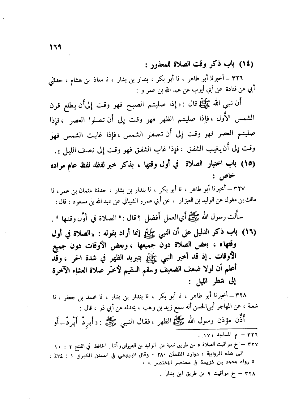 326 - بُنْدَارُ بْنُ بَشَّارٍ، نا مُعَاذُ بْنُ هِشَامٍ، حَدَّثَنِي أَبِي، عَنْ قَتَادَةَ، عَنْ أَبِي أَيُّوبَ، عَنْ عَبْدِ اللَّهِ بْنِ عَمْرٍو، أَنَّ نَبِيَّ اللَّهِ صَلَّى اللهُ عَلَيْهِ وَسَلَّمَ قَالَ: «§إِذَا صَلَّيْتُمُ الصُّبْحَ فَهُوَ وَقْتٌ إِلَى أَنْ يَطْلُعَ قَرْنُ الشَّمْسِ الْأَوَّلِ، فَإِذَا صَلَّيْتُمُ الظُّهْرَ فَهُوَ وَقْتٌ إِلَى أَنْ تُصَلُّوا الْعَصْرَ، فَإِذَا صَلَّيْتُمُ الْعَصْرَ فَهُوَ وَقْتٌ إِلَى أَنْ تَصْفَرَّ الشَّمْسُ، فَإِذَا غَابَتِ الشَّمْسُ فَهُوَ وَقْتٌ إِلَى أَنْ يَغِيبَ الشَّفَقُ، فَإِذَا غَابَ الشَّفَقُ فَهُوَ وَقْتٌ إِلَى نِصْفِ اللَّيْلِ»