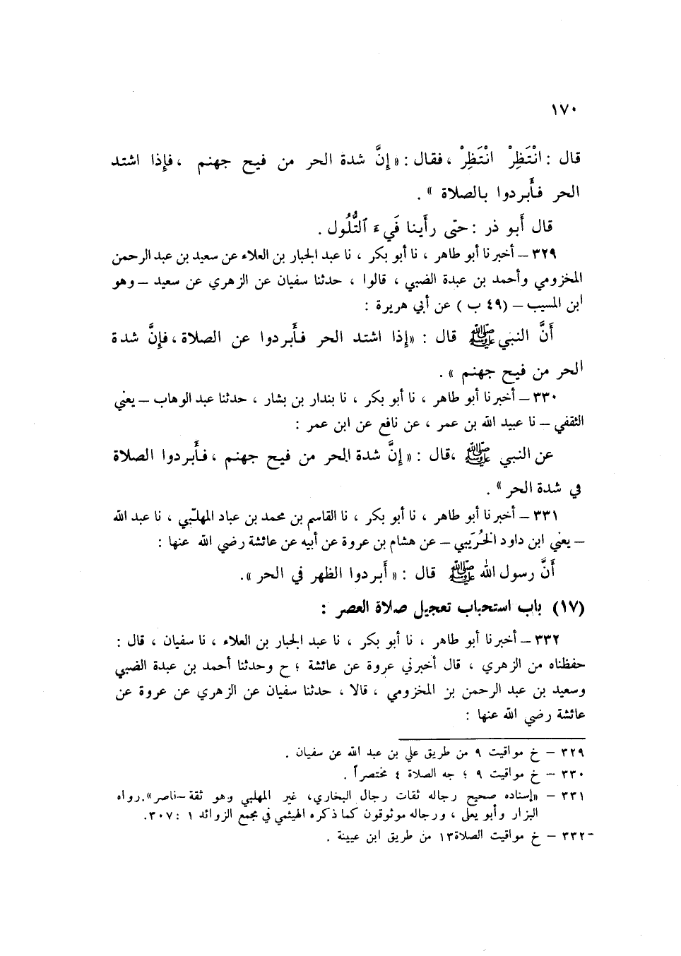 329 - نا عَبْدُ الْجَبَّارِ بْنُ الْعَلَاءِ، عَنْ سَعِيدِ بْنِ عَبْدِ الرَّحْمَنِ الْمَخْزُومِيُّ، وَأَحْمَدَ بْنِ عَبْدَةَ الضَّبِّيِّ قَالُوا: حَدَّثَنَا سُفْيَانُ، عَنِ الزُّهْرِيِّ، عَنْ سَعِيدٍ وَهُوَ ابْنُ الْمُسَيِّبِ، عَنْ أَبِي هُرَيْرَةَ، أَنَّ النَّبِيَّ صَلَّى اللهُ عَلَيْهِ وَسَلَّمَ قَالَ: «§إِذَا اشْتَدَّ الْحَرُّ فَأَبْرِدُوا عَنِ الصَّلَاةِ فَإِنَّ شِدَّةَ الْحَرِّ مِنْ فَيْحِ جَهَنَّمَ»