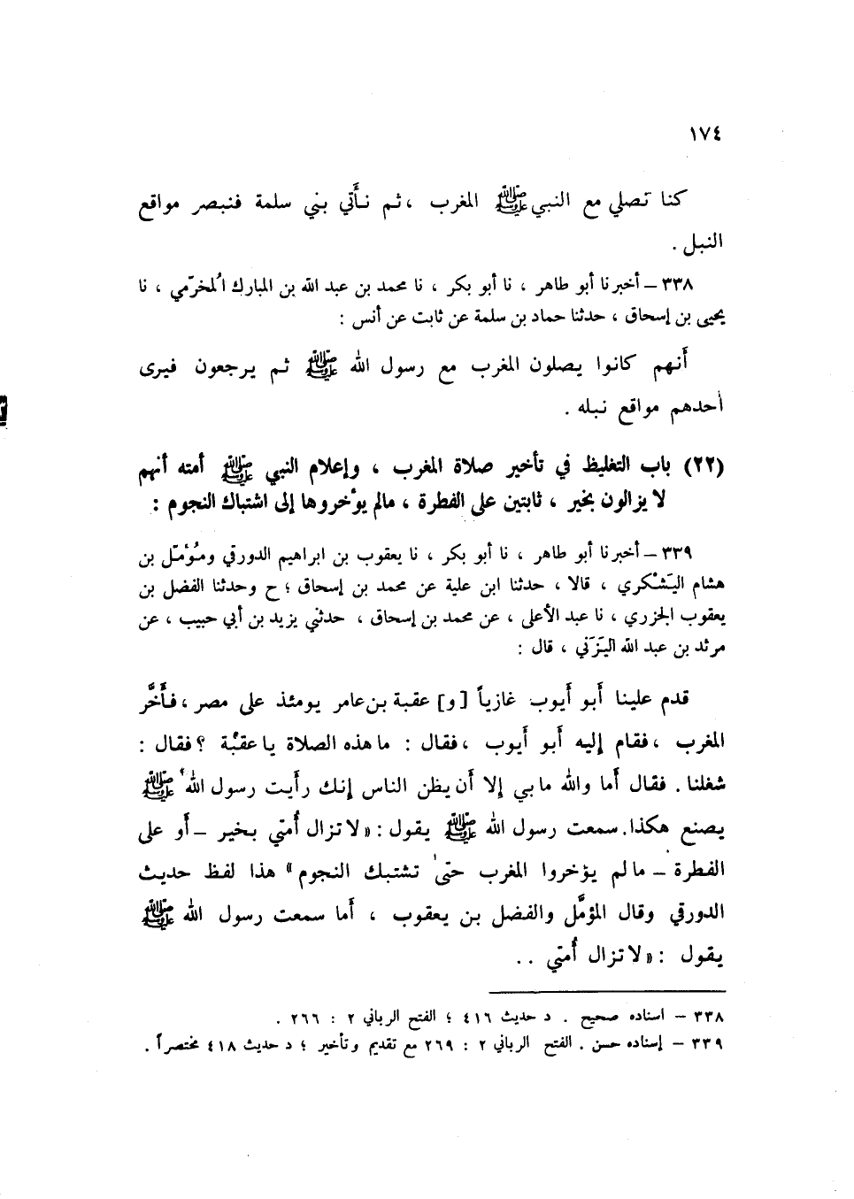 339 - نا يَعْقُوبُ بْنُ إِبْرَاهِيمَ الدَّوْرَقِيُّ، وَمُؤَمَّلُ بْنُ هِشَامٍ الْيَشْكُرِيُّ قَالَا: حَدَّثَنَا ابْنُ عُلَيَّةَ، عَنْ مُحَمَّدِ بْنِ إِسْحَاقَ، ح وَحَدَّثَنَا الْفَضْلُ بْنُ يَعْقُوبَ الْجَزَرِيُّ، نا عَبْدُ الْأَعْلَى، عَنْ مُحَمَّدِ بْنِ إِسْحَاقَ، حَدَّثَنِي يَزِيدُ بْنُ أَبِي حَبِيبٍ، عَنْ مَرْثَدِ بْنِ عَبْدِ اللَّهِ الْيَزَنِيِّ قَالَ: قَدِمَ عَلَيْنَا أَبُو أَيُّوبَ غَازِيًا، وَعُقْبَةُ بْنُ عَامِرٍ يَوْمَئِذٍ عَلَى مِصْرَ فَأَخَّرَ الْمَغْرِبَ فَقَامَ إِلَيْهِ أَبُو أَيُّوبَ فَقَالَ: مَا هَذِهِ الصَّلَاةُ يَا عُقْبَةُ؟ فَقَالَ: شُغِلْنَا، فَقَالَ: أَمَا وَاللَّهِ، مَا بِي إِلَّا أَنْ يَظُنَّ النَّاسُ أَنَّكَ رَأَيْتَ رَسُولَ اللَّهِ صَلَّى اللهُ عَلَيْهِ وَسَلَّمَ يَصْنَعُ هَكَذَا، سَمِعْتُ رَسُولَ اللَّهِ صَلَّى اللهُ عَلَيْهِ وَسَلَّمَ يَقُولُ: «§لَا تَزَالُ أُمَّتِي بِخَيْرٍ أَوْ عَلَى الْفِطْرَةِ مَا لَمْ يُؤَخِّرُوا الْمَغْرِبَ حَتَّى تَشْتَبِكَ النُّجُومُ» هَذَا لَفْظُ حَدِيثِ الدَّوْرَقِيِّ، وَقَالَ الْمُؤَمَّلُ وَالْفَضْلُ بْنُ يَعْقُوبَ: أَمَا سَمِعْتَ رَسُولَ اللَّهِ صَلَّى اللهُ عَلَيْهِ وَسَلَّمَ يَقُولُ: «لَا تَزَالُ أُمَّتِي. .» ؟ نا مُحَمَّدُ بْنُ مُوسَى الْحَرَشِيُّ، نا زِيَادُ بْنُ عَبْدِ اللَّهِ، نا مُحَمَّدُ بْنُ إِسْحَاقَ، عَنْ يَزِيدَ بْنِ أَبِي حَبِيبٍ: فَذَكَرَ الْحَدِيثَ، وَقَالَ: أَمَا سَمِعْتَ رَسُولَ اللَّهِ صَلَّى اللهُ عَلَيْهِ وَسَلَّمَ يَقُولُ: «لَا تَزَالُ أُمَّتِي بِخَيْرٍ أَوْ عَلَى الْفِطْرَةِ مَا لَمْ يُؤَخِّرُوا الْمَغْرِبَ حَتَّى تَشْتَبِكَ النُّجُومُ» ؟ قَالَ: بَلَىK339 - قال الأعظمي: إسناده حسن
