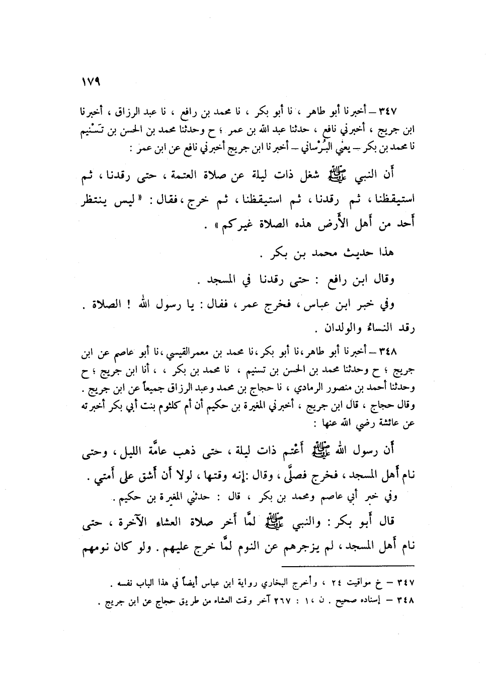 347 - نا مُحَمَّدُ بْنُ رَافِعٍ، نا عَبْدُ الرَّزَّاقِ، أَخْبَرَنَا ابْنُ جُرَيْجٍ، أَخْبَرَنِي نَافِعٌ، حَدَّثَنَا عَبْدُ اللَّهِ بْنُ عُمَرَ، ح وَحَدَّثَنَا مُحَمَّدُ بْنُ الْحَسَنِ بْنِ تَسْنِيمٍ، نا مُحَمَّدُ بْنُ بَكْرٍ يَعْنِي الْبُرْسَانِيَّ، أَخْبَرَنَا ابْنُ جُرَيْجٍ، أَخْبَرَنِي نَافِعٌ، عَنِ ابْنِ عُمَرَ، أَنَّ النَّبِيَّ صَلَّى اللهُ عَلَيْهِ وَسَلَّمَ §شُغِلَ ذَاتَ لَيْلَةٍ، عَنْ صَلَاةِ الْعَتَمَةِ حَتَّى رَقَدْنَا، ثُمَّ اسْتَيْقَظْنَا، ثُمَّ رَقَدْنَا، ثُمَّ اسْتَيْقَظْنَا، ثُمَّ خَرَجَ، فَقَالَ: «لَيْسَ يَنْتَظِرُ أَحَدٌ مِنْ أَهْلِ الْأَرْضِ هَذِهِ الصَّلَاةَ غَيْرُكُمْ» هَذَا حَدِيثُ مُحَمَّدِ بْنِ بَكْرٍ، وَقَالَ ابْنُ رَافِعٍ: حَتَّى رَقَدْنَا فِي الْمَسْجِدِ وَفِي خَبَرِ ابْنِ عَبَّاسٍ فَخَرَجَ عُمَرُ فَقَالَ: يَا رَسُولَ اللَّهِ، الصَّلَاةُ رَقَدَ النِّسَاءُ وَالْوِلْدَانُ
