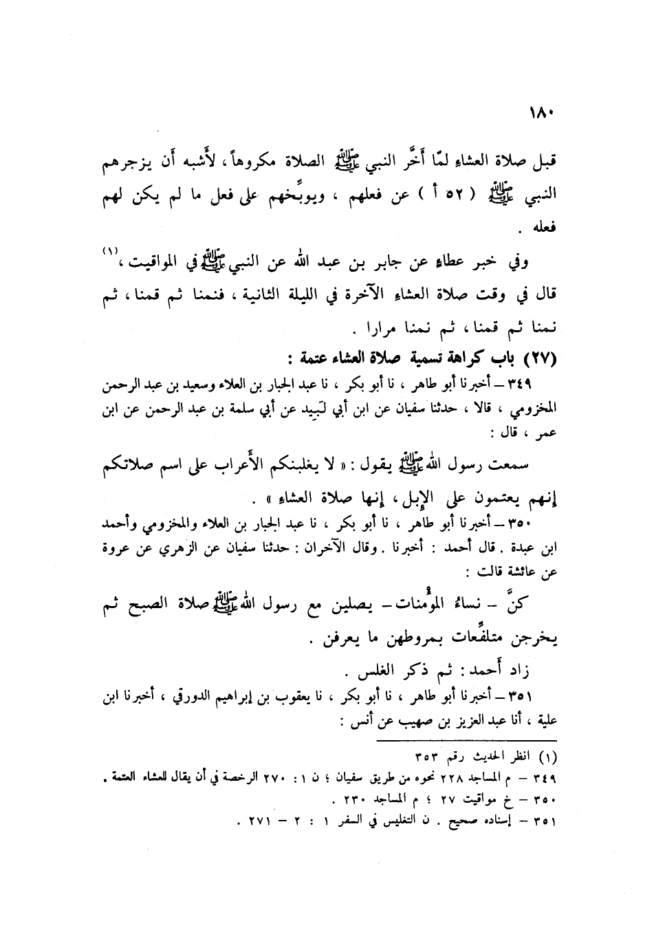 349 - نا عَبْدُ الْجَبَّارِ بْنُ الْعَلَاءِ، وَسَعِيدُ بْنُ عَبْدِ الرَّحْمَنِ الْمَخْزُومِيُّ قَالَا: حَدَّثَنَا سُفْيَانُ، عَنِ ابْنِ أَبِي لَبِيدٍ، عَنْ أَبِي سَلَمَةَ بْنِ عَبْدِ الرَّحْمَنِ، عَنِ ابْنِ عُمَرَ قَالَ: سَمِعْتُ رَسُولَ اللَّهِ صَلَّى اللهُ عَلَيْهِ وَسَلَّمَ يَقُولُ: «§لَا يَغْلِبَنَّكُمُ الْأَعْرَابُ عَلَى اسْمِ صَلَاتِكُمْ، إِنَّهُمْ يُعْتِمُونَ عَلَى الْإِبِلِ إِنَّهَا صَلَاةُ الْعِشَاءِ»