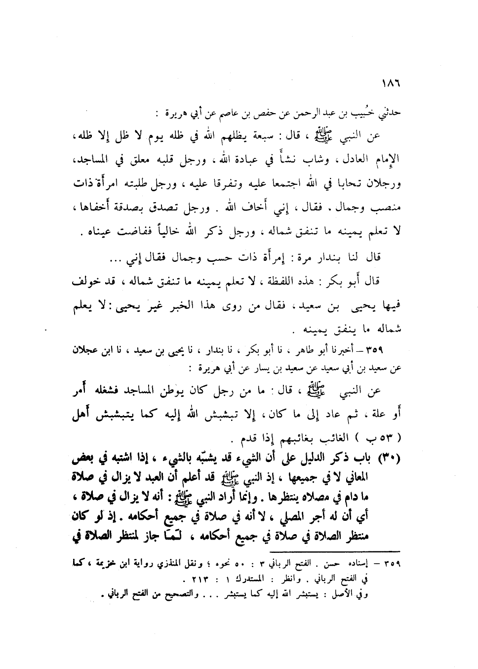 359 - نا بُنْدَارٌ، نا يَحْيَى بْنُ سَعِيدٍ، نا ابْنُ عَجْلَانَ، عَنْ سَعِيدِ بْنِ أَبِي سَعِيدٍ، عَنْ سَعِيدِ بْنِ يَسَارٍ، عَنْ أَبِي هُرَيْرَةَ، عَنِ النَّبِيِّ صَلَّى اللهُ عَلَيْهِ وَسَلَّمَ قَالَ: «§مَا مِنْ رَجُلٍ كَانَ يُوَطِّنُ الْمَسَاجِدَ فَشَغَلَهُ أَمْرٌ أَوْ عِلَّةٌ، ثُمَّ عَادَ إِلَى مَا كَانَ إِلَّا تَبَشْبَشَ اللَّهُ إِلَيْهِ كَمَا يَتَبَشْبَشُ أَهْلُ الْغَائِبِ بِغَائِبِهِمْ إِذَا قَدِمَ» K359 - قال الأعظمي: إسناده حسن