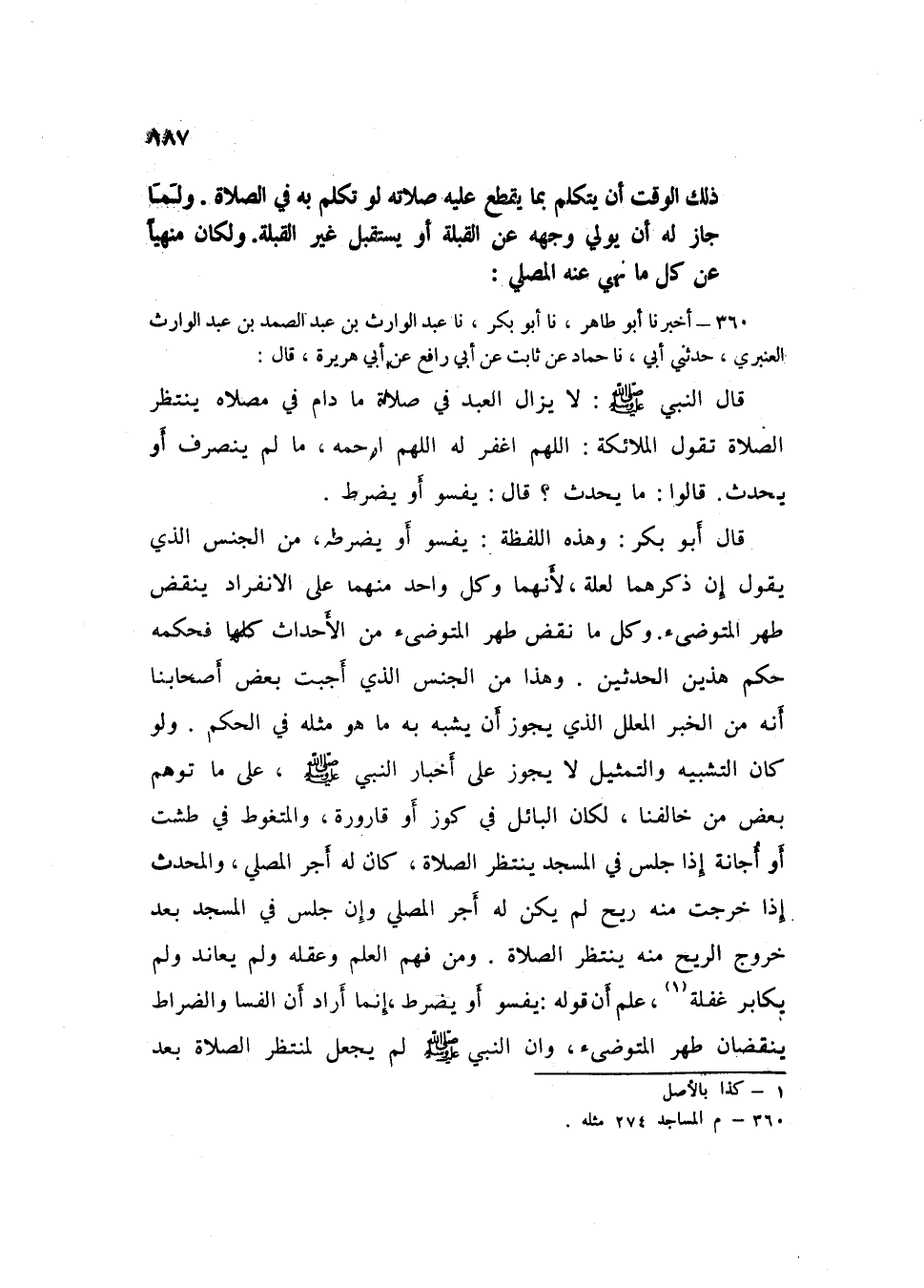 360 - نا عَبْدُ الْوَارِثِ بْنُ عَبْدِ الصَّمَدِ بْنِ عَبْدِ الْوَارِثِ الْعَنْبَرِيُّ، حَدَّثَنِي أَبِي، نا حَمَّادٌ، عَنْ ثَابِتٍ، عَنْ أَبِي رَافِعٍ، عَنْ أَبِي هُرَيْرَةَ قَالَ: قَالَ النَّبِيُّ صَلَّى اللهُ عَلَيْهِ وَسَلَّمَ: «§لَا يَزَالُ الْعَبْدُ فِي صَلَاةٍ مَا دَامَ فِي مُصَلَّاهُ يَنْتَظِرُ الصَّلَاةَ، تَقُولُ الْمَلَائِكَةُ اللَّهُمَّ اغْفِرْ لَهُ اللَّهُمَّ ارْحَمْهُ، مَا لَمْ يَنْصَرِفْ أَوْ يُحْدِثْ» قَالُوا: مَا يُحْدِثُ؟ قَالَ: «يَفْسُو أَوْ يَضْرِطُ» قَالَ أَبُو بَكْرٍ: وَهَذِهِ اللَّفْظَةُ يَفْسُو أَوْ يَضْرِطُ مِنَ الْجِنْسِ الَّذِي يَقُولُ إِنَّ ذِكْرَهُمَا لِعِلَّةٍ؛ لِأَنَّهُمَا وَكُلُّ وَاحِدٍ مِنْهُمَا عَلَى الِانْفِرَادِ يَنْقُضُ طُهْرَ الْمُتَوَضِّئِ، وَكُلُّ مَا نَقَضَ طُهْرَ الْمُتَوَضِّئِ مِنَ الْأَحْدَاثِ كُلِّهَا فَحُكْمُهُ حُكْمُ هَذَيْنِ الْحَدَثَيْنِ، وَهَذَا مِنَ الْجِنْسِ الَّذِي أَجَبْتُ بَعْضَ أَصْحَابِنَا أَنَّهُ مِنَ الْخَبَرِ الْمُعَلَّلِ الَّذِي يَجُوزُ أَنْ يُشَبَّهَ بِهِ مَا هُوَ مِثْلُهُ فِي الْحُكْمِ وَلَوْ كَانَ التَّشْبِيهُ وَالتَّمْثِيلُ لَا يَجُوزُ عَلَى أَخْبَارِ النَّبِيِّ صَلَّى اللهُ عَلَيْهِ وَسَلَّمَ عَلَى مَا تَوَهَّمَ بَعْضُ مَنْ خَالَفَنَا لَكَانَ الْبَائِلُ فِي كُوزٍ أَوْ قَارُورَةٍ وَالْمُتَغَوِّطُ فِي طَشْتٍ، أَوْ أُجَانَةٍ إِذَا جَلَسَ فِي الْمَسْجِدِ يَنْتَظِرُ الصَّلَاةَ كَانَ لَهُ أَجْرُ الْمُصَلِّي، وَالْمُحْدِثُ إِذَا خَرَجَتْ مِنْهُ رِيحٌ لَمْ يَكُنْ لَهُ أَجْرُ الْمُصَلِّي، وَإِنْ جَلَسَ فِي الْمَسْجِدِ بَعْدَ خُرُوجِ الرِّيحِ مِنْهُ يَنْتَظِرُ الصَّلَاةَ، وَمَنْ فَهِمَ الْعِلْمَ وَعَقَلَهُ وَلَمْ يُعَانِدْ وَلَمْ يُكَابِرْ غَفَلَةً عَلِمَ أَنَّ قَوْلَهُ: «يَفْسُو أَوْ يَضْرِطُ» إِنَّمَا أَرَادَ أَنَّ الْفِسَا وَالضِّرَاطُ يَنْقُضَانِ طُهْرَ الْمُتَوَضِّئِ وَأَنَ النَّبِيَّ صَلَّى اللهُ عَلَيْهِ وَسَلَّمَ لَمْ يَجْعَلْ لِمُنْتَظِرِ الصَّلَاةِ بَعْدَ هَذَيْنِ الْحَدَثَيْنِ فَضِيلَةَ الْمُصَلِّي؛ لِأَنَّهُ غَيْرُ الْمُتَوَضِّئِ فَكُلُّ مُنْتَظِرِ الصَّلَاةَ جَالِسٌ فِي الْمَسْجِدِ غَيْرُ طَاهِرٍ طَهَارَةً تُجْزِيهِ الصَّلَاةُ مَعَهَا فَحُكْمُهُ حُكْمُ مَنْ خَرَجَتْ مِنْهُ رِيحٌ نَقَضَتْ عَلَيْهِ الطَّهَارَةَ