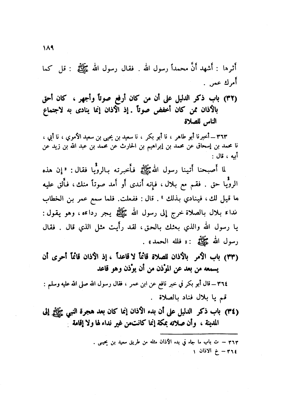 363 - نا سَعِيدُ بْنُ يَحْيَى بْنِ سَعِيدٍ الْأُمَوِيُّ، نا أَبِي، نا مُحَمَّدُ بْنُ إِسْحَاقَ، عَنْ مُحَمَّدِ بْنِ إِبْرَاهِيمَ بْنِ الْحَارِثِ، عَنْ مُحَمَّدِ بْنِ عَبْدِ اللَّهِ بْنِ زَيْدٍ، عَنْ أَبِيهِ قَالَ: لَمَّا أَصْبَحْنَا أَتَيْنَا رَسُولَ اللَّهِ صَلَّى اللهُ عَلَيْهِ وَسَلَّمَ فَأَخْبَرْتُهُ بِالرُّؤْيَا، فَقَالَ: «إِنَّ §هَذِهِ الرُّؤْيَا حَقٌّ، فَقُمْ مَعَ بِلَالٍ فَإِنَّهُ أَنْدَى - أَوْ أَمَدُّ صَوْتًا - مِنْكَ فَأَلْقِ عَلَيْهِ مَا قِيلَ لَكَ فَيُنَادِي بِذَلِكَ» قَالَ: فَفَعَلْتُ فَلَمَّا سَمِعَ عُمَرُ بْنُ الْخَطَّابِ نِدَاءَ بِلَالٍ بِالصَّلَاةِ خَرَجَ إِلَى رَسُولِ اللَّهِ صَلَّى اللهُ عَلَيْهِ وَسَلَّمَ يَجُرُّ رِدَاءَهُ وَهُوَ يَقُولُ: يَا رَسُولَ اللَّهِ وَالَّذِي بَعَثَكَ بِالْحَقِّ لَقَدْ رَأَيْتُ مِثْلَ الَّذِي قَالَ: فَقَالَ رَسُولُ اللَّهِ صَلَّى اللهُ عَلَيْهِ وَسَلَّمَ: «فَلِلَّهِ الْحَمْدُ»