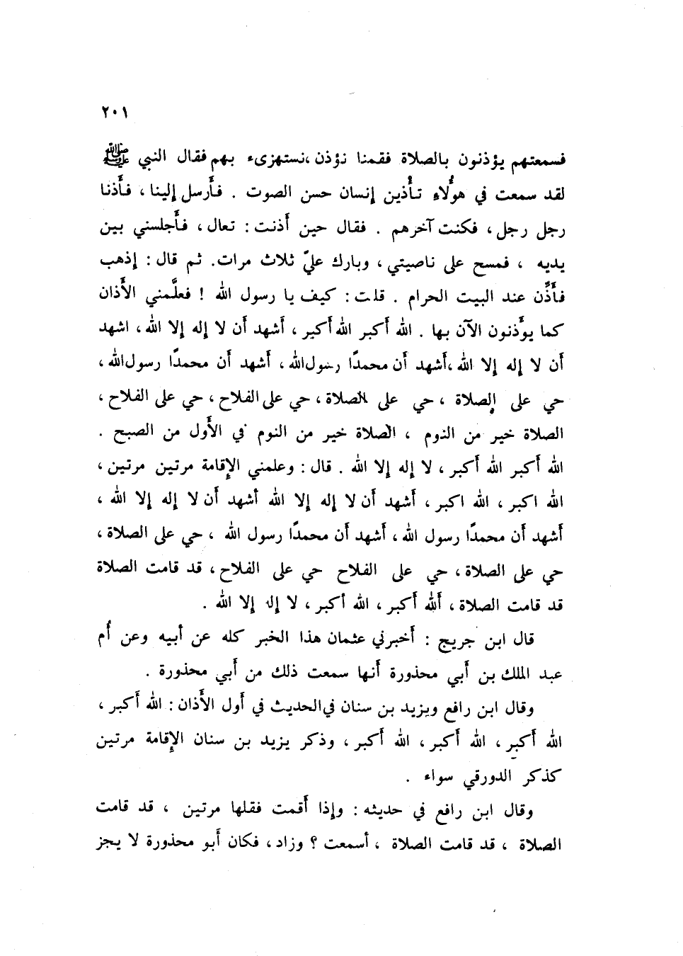 لَمَّا رَجَعَ النَّبِيُّ صَلَّى اللَّهُ عَلَيْهِ وَسَلَّمَ مِنْ حُنَيْنٍ خَرَجْتُ عَاشِرَ عَشَرَةٍ مِنْ مَكَّةَ نَطْلُبُهُمْ ، فَسَمِعْتَهُمْ يُؤَذِّنُونَ بِالصَّلاَةِ ، فَقُمْنَا نُؤَذِّنُ نَسْتَهْزِئُ بِهِمْ ، فَقَالَ النَّبِيُّ صَلَّى اللَّهُ عَلَيْهِ وَسَلَّمَ : لَقَدْ سَمِعْتُ فِي هَؤُلاَءِ تَأْذِينَ إِنْسَانٍ حَسَنِ الصَّوْتِ ، فَأَرْسَلَ إِلَيْنَا ، فَأَذَّنَّا رَجُلاً رَجُلاً ، فَكُنْتُ آخِرَهُمْ ، فَقَالَ حِينَ أَذَّنْتُ : تَعَالَ ، فَأَجْلَسَنِي بَيْنَ يَدَيْهِ فَمَسَحَ عَلَى نَاصِيَتِي وَبَارَكَ عَلَيَّ ثَلاَثَ مَرَّاتٍ ، ثُمَّ ، قَالَ : اذْهَبْ فَأَذِّنْ عِنْدَ الْبَيْتِ الْحَرَامِ ، قُلْتُ : كَيْفَ يَا رَسُولَ اللهِ ؟ فَعَلَّمَنِي الأَذَانَ كَمَا يُؤَذِّنُونَ الآنَ بِهَا : اللَّهُ أَكْبَرُ ، اللَّهُ أَكْبَرُ ، أَشْهَدُ أَنْ لاَ إِلَهَ إِلاَّ اللَّهُ ، أَشْهَدُ أَنْ لاَ إِلَهَ إِلاَّ اللَّهُ ، أَشْهَدُ أَنَّ مُحَمَّدًا رَسُولُ اللهِ ، أَشْهَدُ أَنَّ مُحَمَّدًا رَسُولُ اللهِ ، حَيَّ عَلَى الصَّلاَةِ ، حَيَّ عَلَى الصَّلاَةِ ، حَيَّ عَلَى الْفَلاَحِ ، حَيَّ عَلَى الْفَلاَحِ ، الصَّلاَةُ خَيْرٌ مِنَ النَّوْمِ ، الصَّلاَةُ خَيْرٌ مِنَ النَّوْمِ ، فِي الأَوَّلِ مِنَ الصُّبْحِ ، اللَّهُ أَكْبَرُ ، اللَّهُ أَكْبَرُ ، لاَ إِلَهَ إِلاَّ اللَّهُ ، قَالَ : وَعَلَّمَنِي الإِِقَامَةَ مَرَّتَيْنِ مَرَّتَيْنِ ، اللَّهُ أَكْبَرُ ، اللَّهُ أَكْبَرُ ، أَشْهَدُ أَنْ لاَ إِلَهَ إِلاَّ اللَّهُ ، أَشْهَدُ أَنْ لاَ إِلَهَ إِلاَّ اللَّهُ ، أَشْهَدُ أَنَّ مُحَمَّدًا رَسُولُ اللهِ ، أَشْهَدُ أَنَّ مُحَمَّدًا رَسُولُ اللهِ ، حَيَّ عَلَى الصَّلاَةِ ، حَيَّ عَلَى الصَّلاَةِ ، حَيَّ عَلَى الْفَلاَحِ ، حَيَّ عَلَى الْفَلاَحِ ، قَدْ قَامَتِ الصَّلاَةُ ، قَدْ قَامَتِ الصَّلاَةُ ، اللَّهُ أَكْبَرُ ، اللَّهُ أَكْبَرُ ، لاَ إِلَهَ إِلاَّ اللَّهُ.